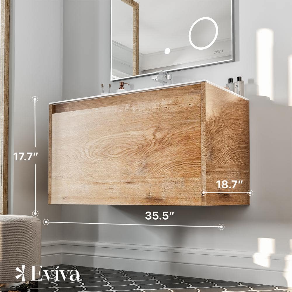 The Eviva Madeira 36-inch Bathroom Vanity combines natural elegance with modern convenience. Crafted with a real oak veneer finish, it boasts a sleek, white acrylic top and an integrated sink, delivering both beauty and durability. Its soft-closing drawers make storage a breeze while the pre-drilled sink hole streamlines installation.