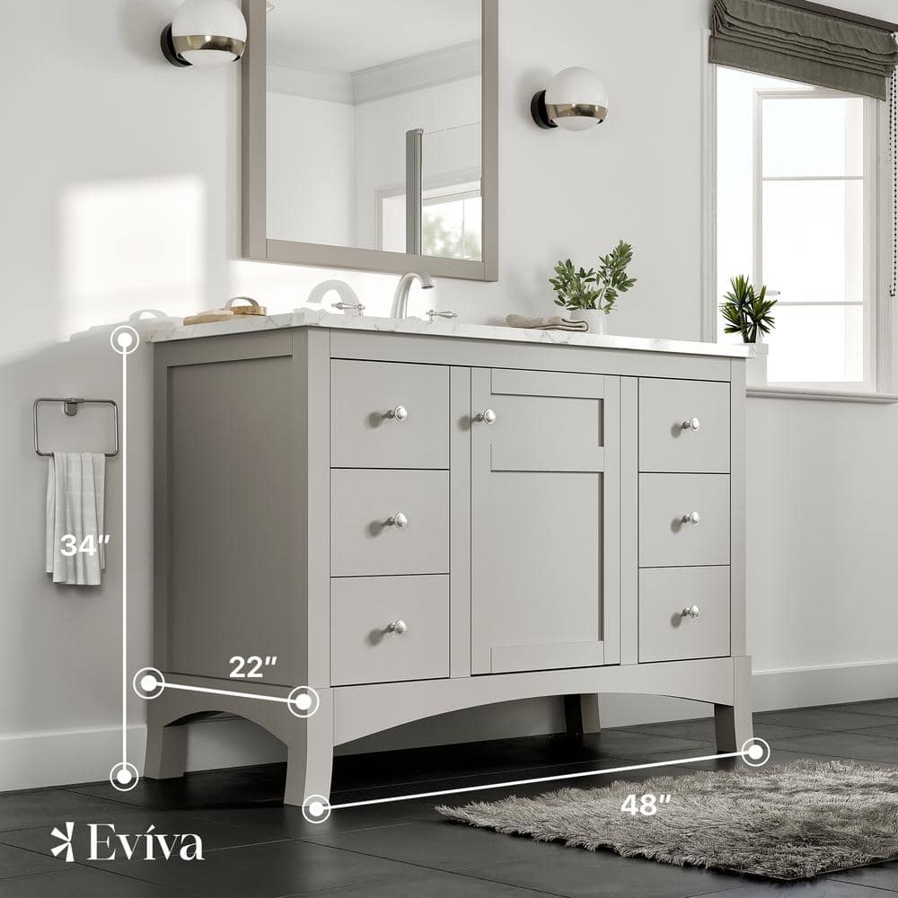 The Eviva New York 48" Bathroom Vanity blends sophistication with functionality. Featuring a luxurious white Carrara marble top and a sleek gray solid wood base, this pre-assembled piece not only enhances bathroom aesthetics but also assures enduring quality. Ideal for both modern and classic bathroom designs, it offers ample storage and style.