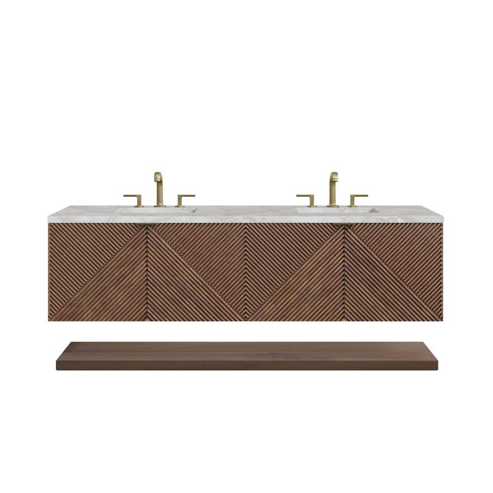 The Marcello Double Vanity is a masterpiece of mid-century modern design, blending warm chestnut tones with the sleek sophistication of a Victorian Silver Quartz top. Its reeded door fronts and champagne brass hardware add a touch of luxury, while the floating shelf creates a contemporary aesthetic. Style it with minimalist decor to highlight its geometric perfection, making it a centerpiece of refined living.