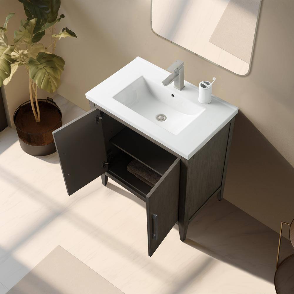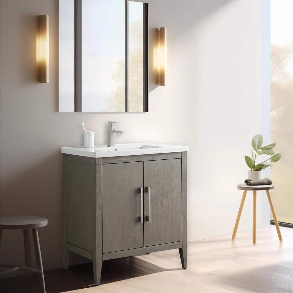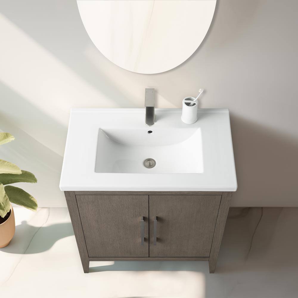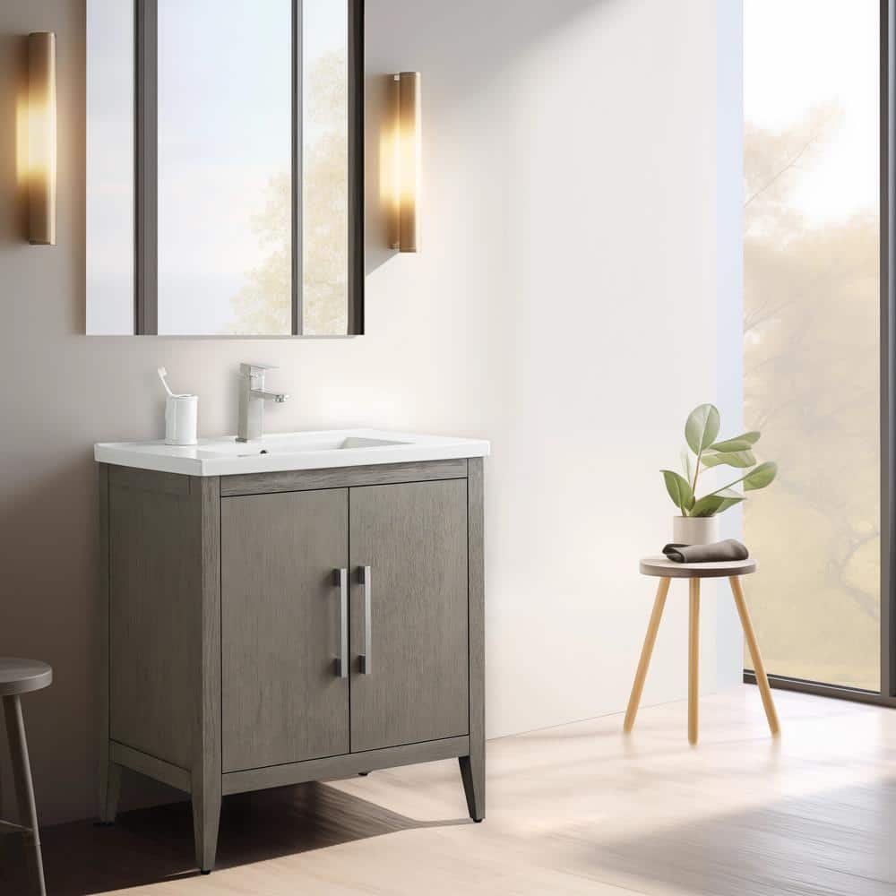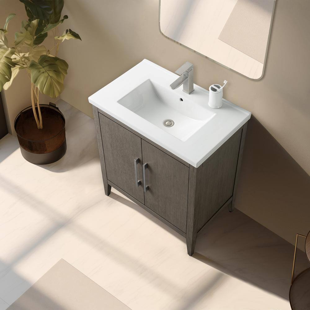 The Vanity Art 30 in. Single Sink Bathroom Vanity blends elegance with practicality, featuring a durable ceramic top and poplar wood cabinet for a stylish, inviting look. Its driftwood gray finish complements any modern decor, while offering ample storage with adjustable shelves to keep your bathroom essentials organized.