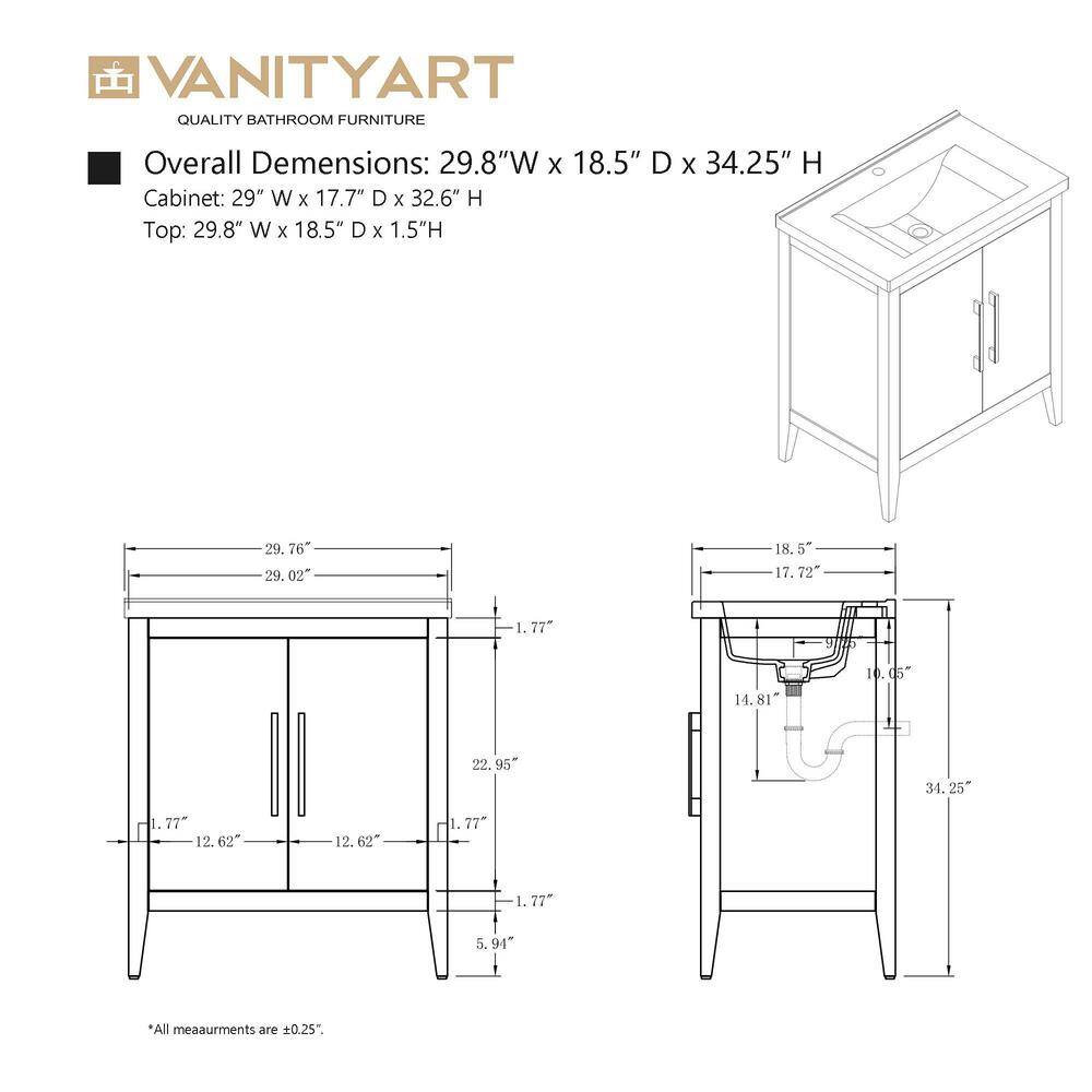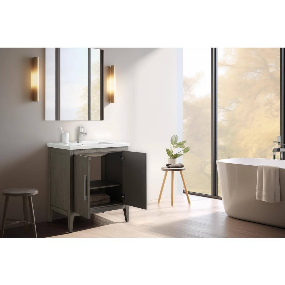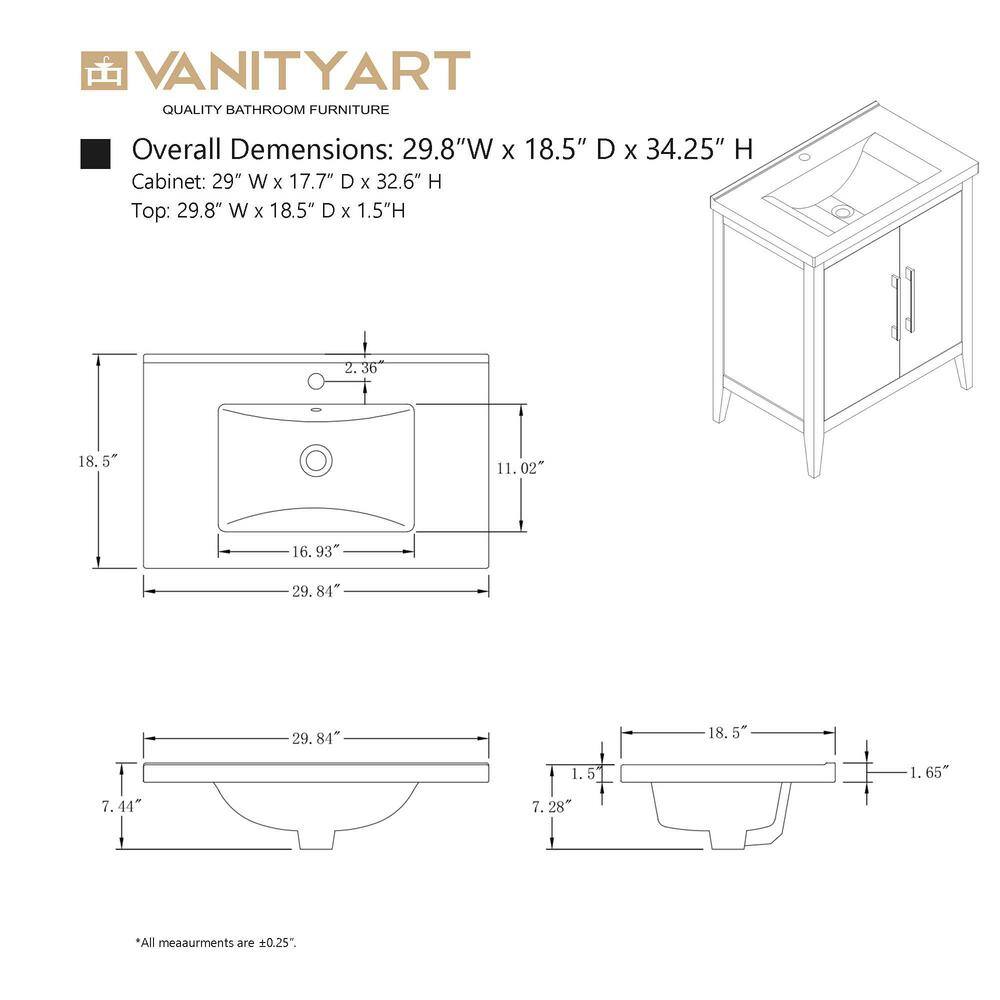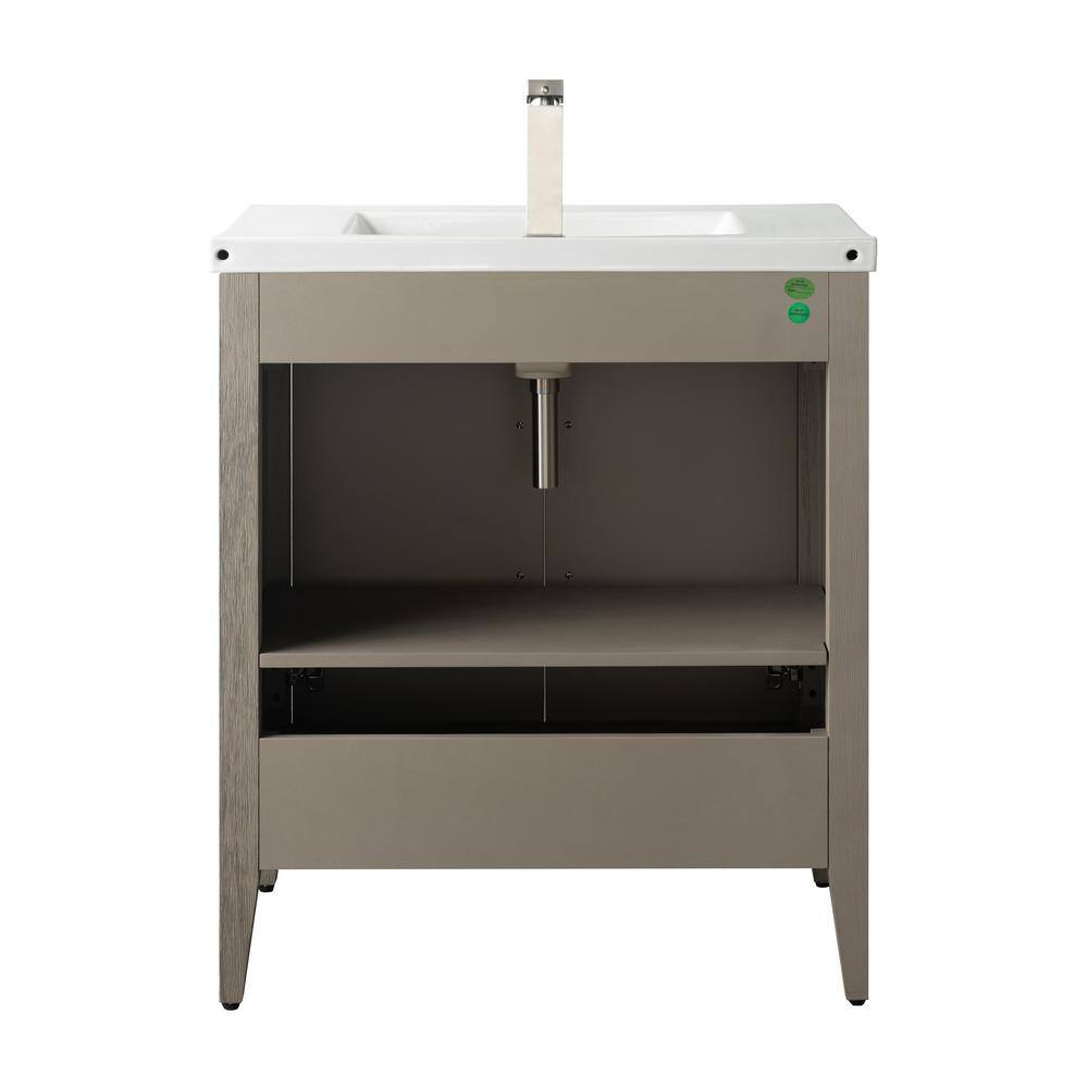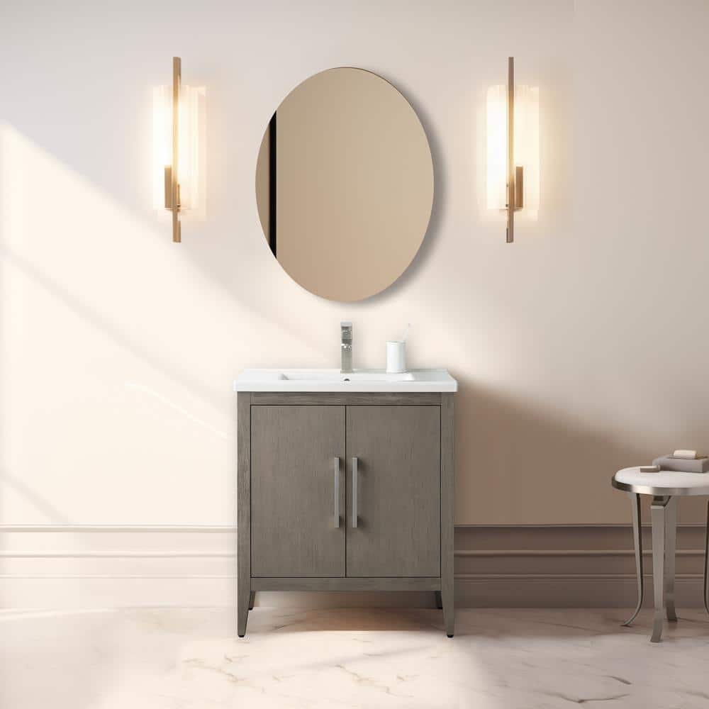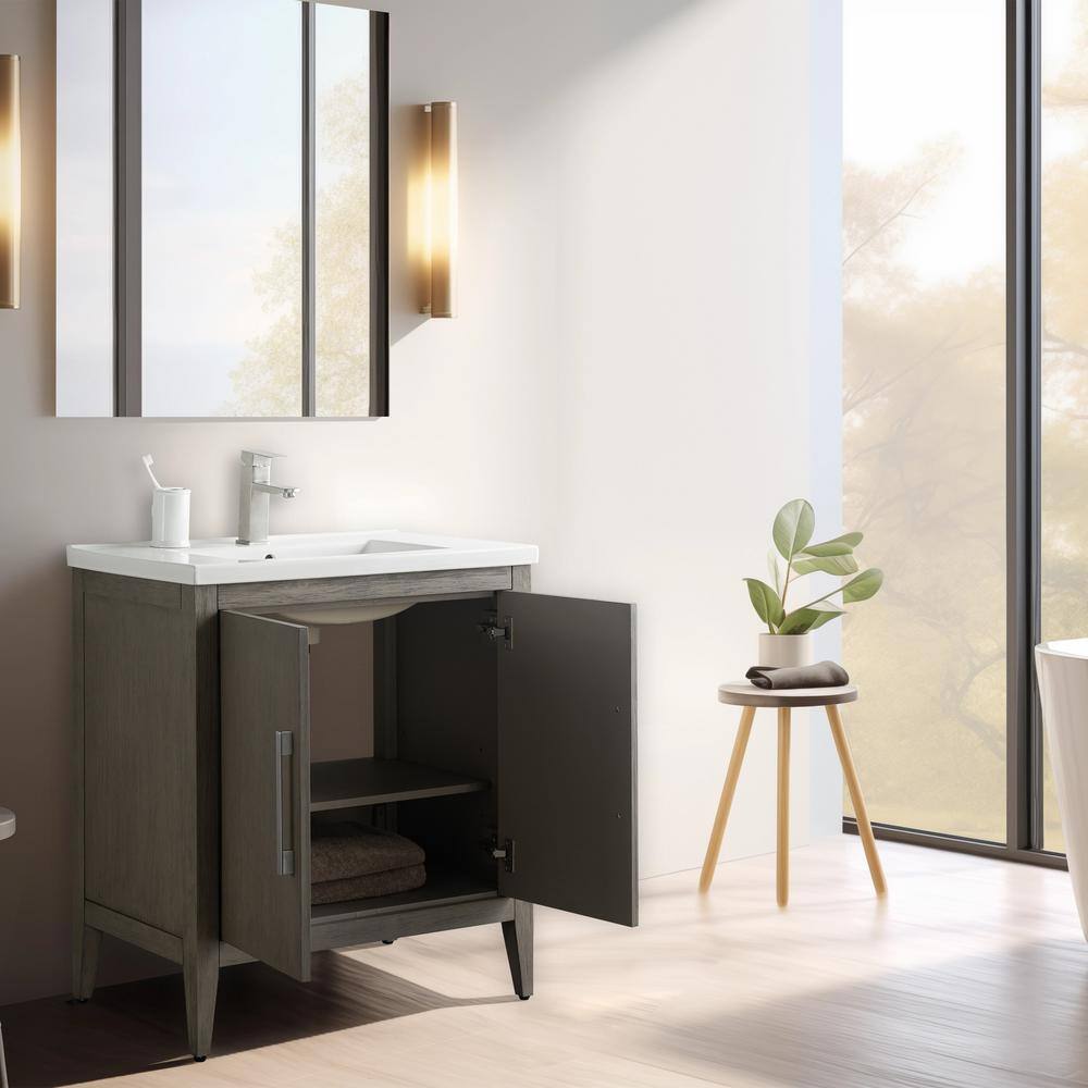 The Vanity Art 30 in. Single Sink Bathroom Vanity blends elegance with practicality, featuring a durable ceramic top and poplar wood cabinet for a stylish, inviting look. Its driftwood gray finish complements any modern decor, while offering ample storage with adjustable shelves to keep your bathroom essentials organized.