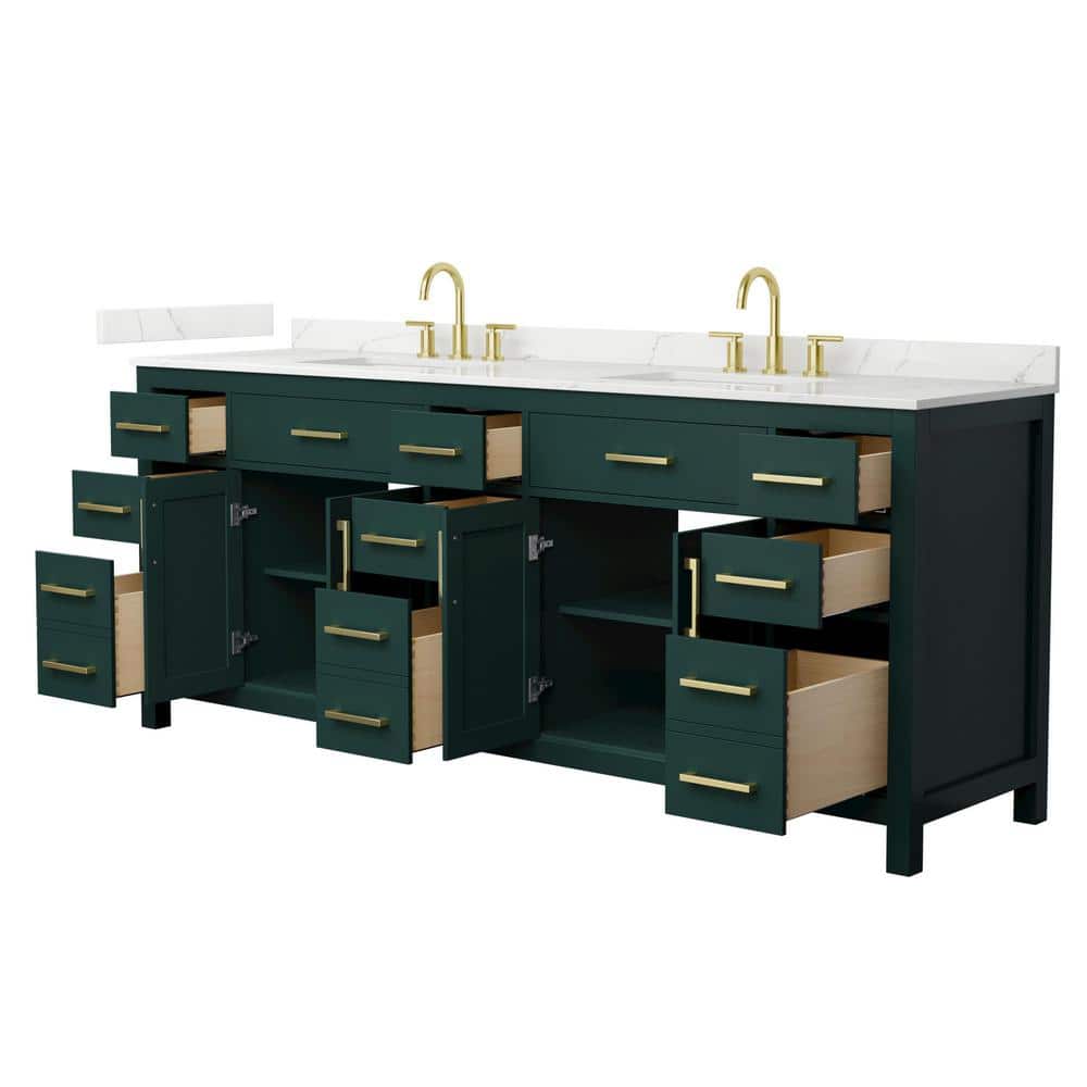 The Wyndham Collection Beckett 84 in. Double Freestanding Green Bath Vanity combines elegant design with practical functionality. Featuring a Giotto Quartz top, soft-close doors, and ample storage, this vanity is perfect for modern bathrooms.