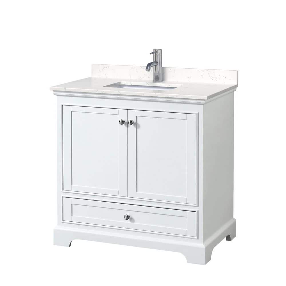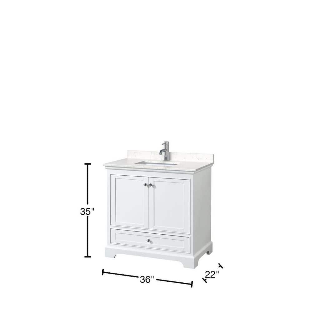 The Wyndham Collection Deborah 36" Single Bath Vanity combines timeless design with modern functionality. Featuring a Carrara cultured marble top and a white plywood cabinet, it offers ample storage and a sophisticated look for any bathroom.