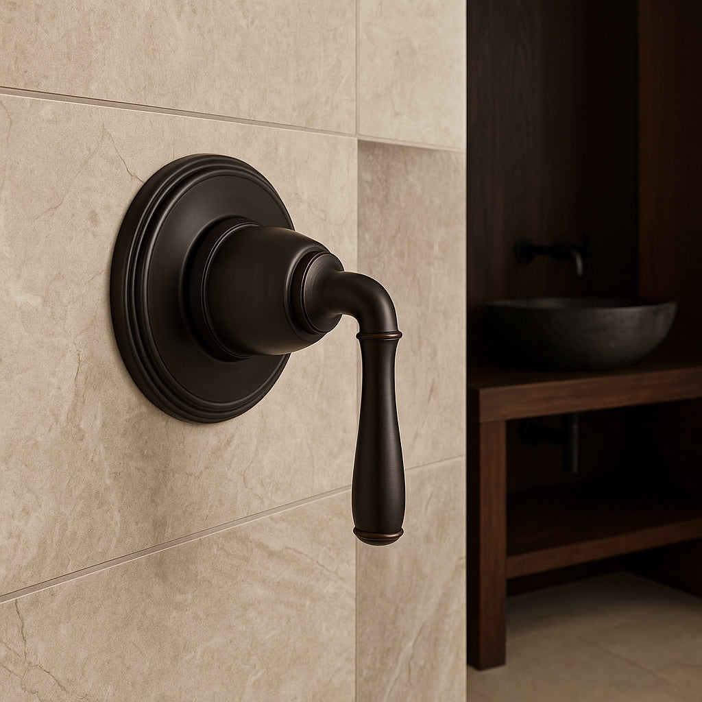 The KOHLER Oil-Rubbed Bronze Lever Shower Handle combines ergonomic design with a luxurious finish, ensuring both functionality and style. Its durable construction and ADA compliance make it a reliable choice for any bathroom.