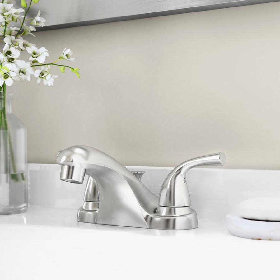 3-hole 4-in installation Plastic pop-up ADA Compliant 1.20 gpm at 60 psi, 4.5 L/min at 414 kPa WaterSense® labeled faucet uses at least 20% less water than the industry standard without compromising performance Rigid spout Pop-up drain included to complete the look ADA compliance ensures easier, safer and more comfortable use for those with disabilities or limited mobility Lifetime faucet and finish warranty gives you peace of mind
