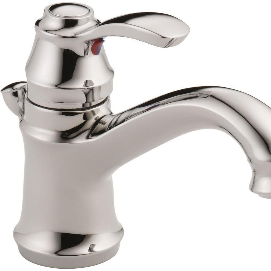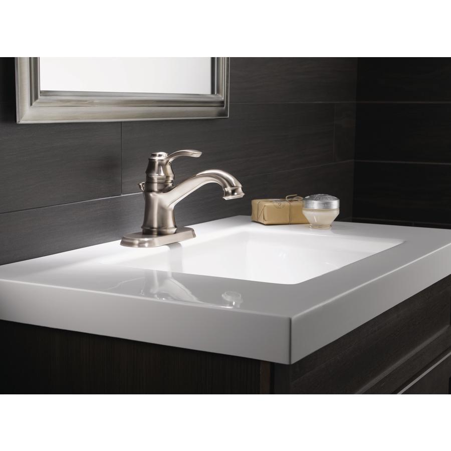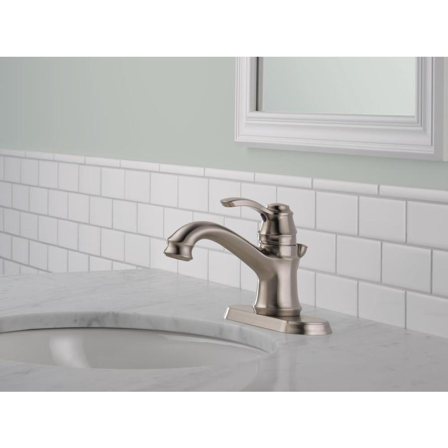 Stainless finish bathroom faucet from the Nura collection 4-in centerset for easy installation Single lever handle allows for convenient one-handed use Drain included to complete the look Meets WaterSense criteria to conserve water without sacrificing performance Lifetime faucet and finish warranty gives you peace of mind Porcelain white and chrome finish buttons included to best match any decor Valve included for your convenience ADA-compliant faucet is easier, safer and more comfortable to use for those with disabilities or limited mobility