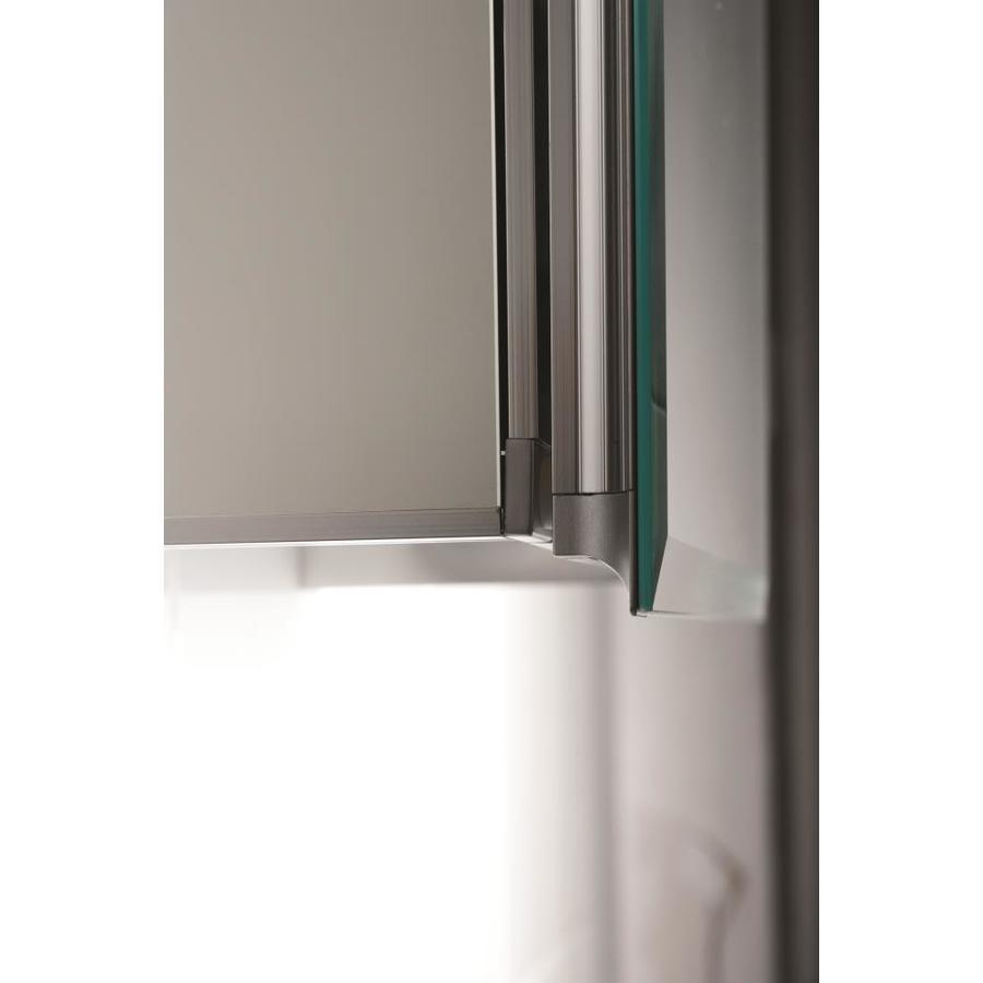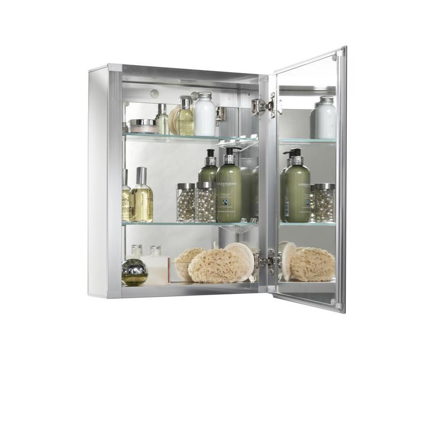Constructed from high quality aluminum with durable double sided mirrored doors and a mirrored internal back panel Two adjustable shelves 105 degree hinge Cabinet can be surface or recessed mounted Decorative mirrored glass side panels are included for surface mounting Features easy to install Hang 'N’ Lock system; the patented bracket is a simple and safe solution that provides the flexibility to change the level of your cabinet after having drilled your holes