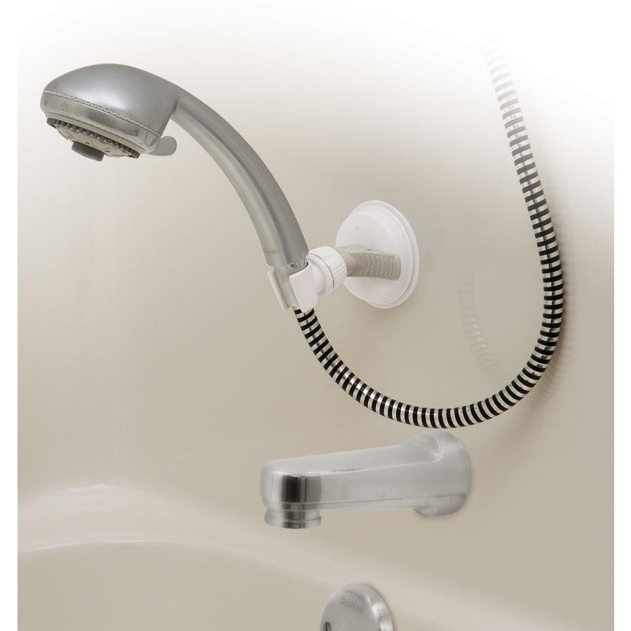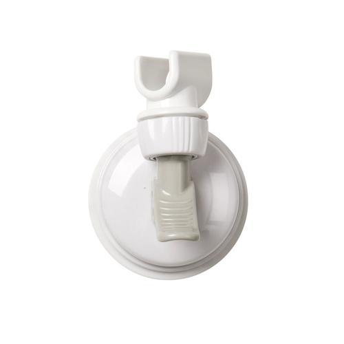 Simple suction cup design allows user to easily position shower head to any height desired Easy installation and removal with flip up release latch, no tools required Attaches to smooth, dry, non-porous surfaces including tile 3-in x 3-in or greater White with gray tabs