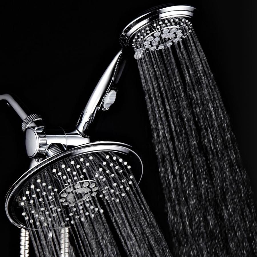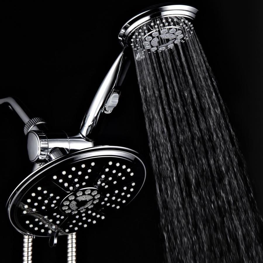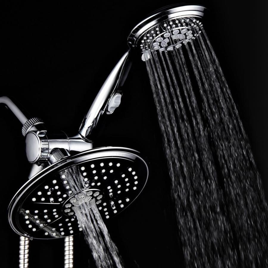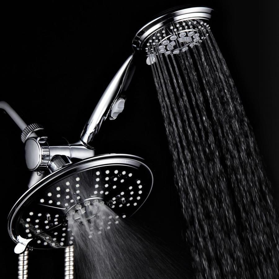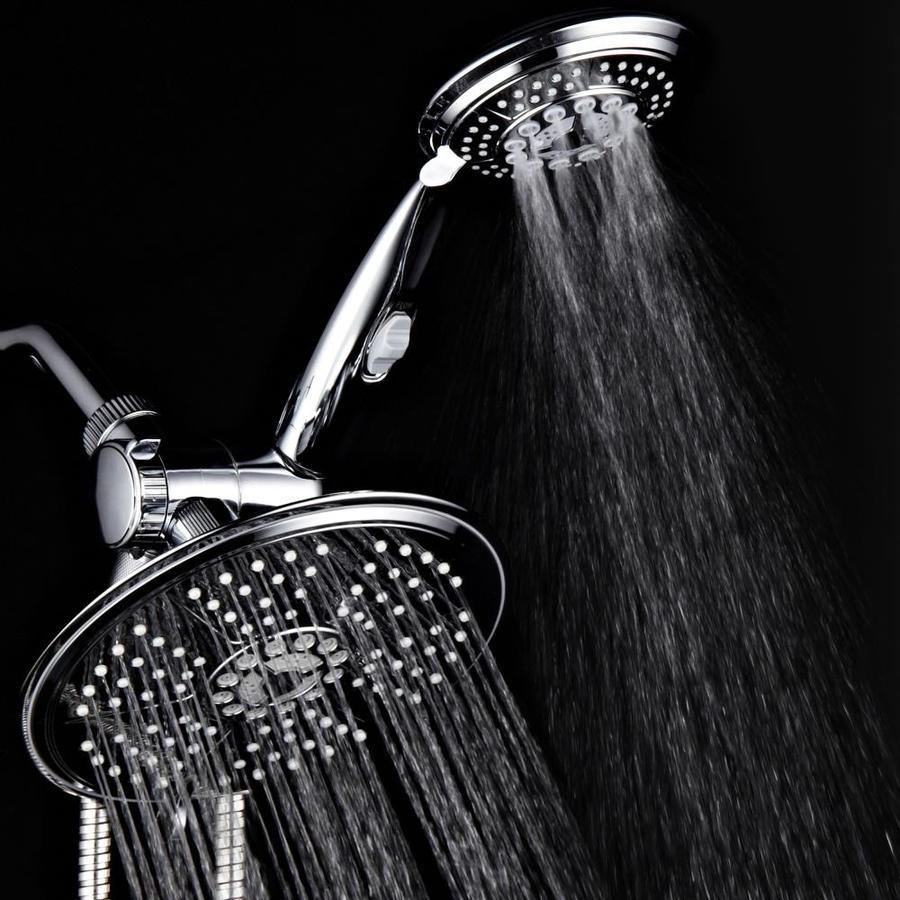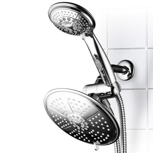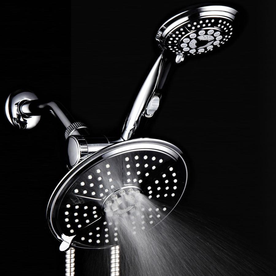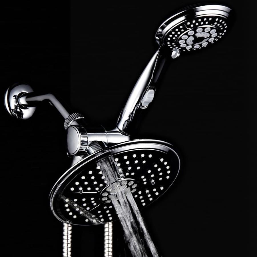Rainfall/handheld Combo Patented pause switch on hand shower handle 3 way diverter, use showerheads together or separately 7-setting 7 In. rainfall shower head 6-setting 4 In. hand shower with on/off pause switch Slimline bell design Settings of each shower include: power rain, pulsating massage, hydrating mist, rain/massage, rain/mist and water-saving economy rain Premium 5 to 7 Ft. stretchable stainless steel hose for maximum reach with conical brass hose nuts for easy hand tightening Choose from 38 full and combined water flow patterns