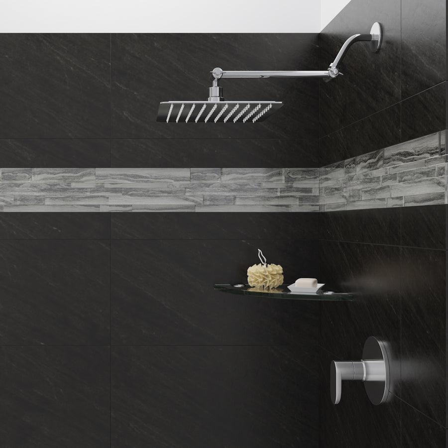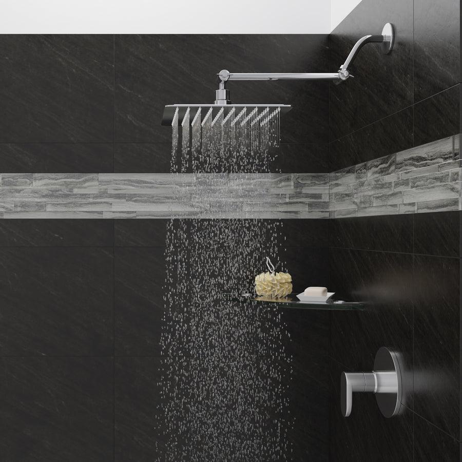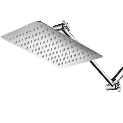 High fashion ergonomic slimline design adds style and ambiance to your bath decor Ultra thin profile 10 In. x 10 In. square showerhead face 11 In. height and angle adjustable solid brass extension arm Shower head is made from 100% stainless steel High polish chrome plated finish 2 Ft. vertical movement range