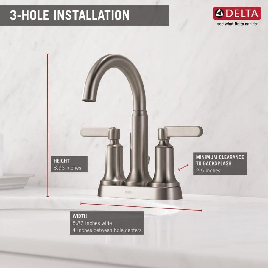SpotShield™ brushed nickel finish centerset bathroom faucet from the Alux collection features clean lines and dapper details for a refined look 2-handle lever design makes it easy to control the temperature and flow of water WaterSense® labeled to conserve water without sacrificing performance, with a max flow rate of 1.2-GPM Plastic drain and valve included for easy installation Worry-Free Drain Catch prevents small items like pills, jewelry or other valuables from washing down the drain SpotShield™ Technology repels water spots and fingerprints for a cleaner look, and the finish features antimicrobial protection to resist odor-causing microbial growth ADA compliance ensures easier, safer and more comfortable use for those with disabilities or limited mobility