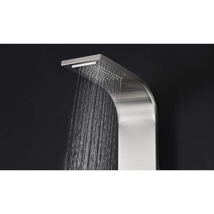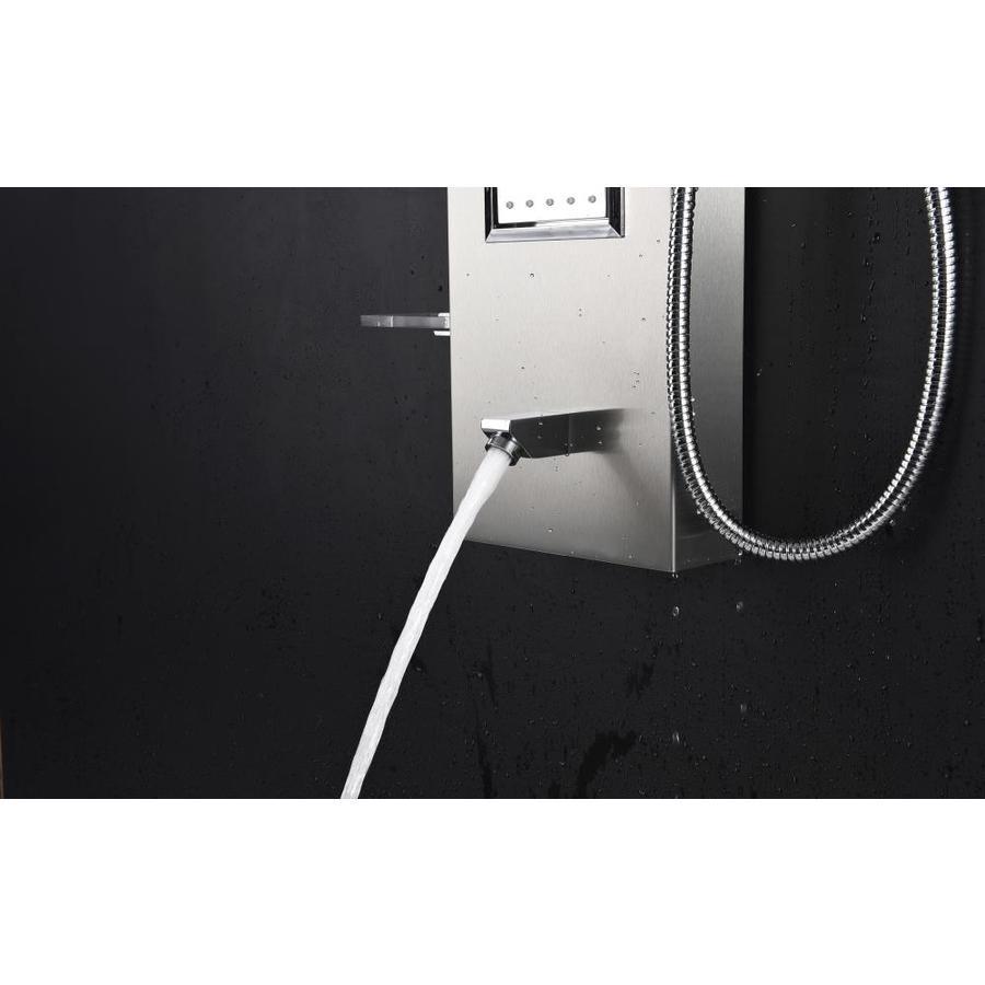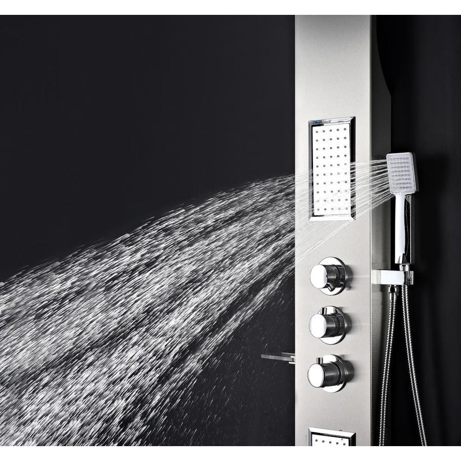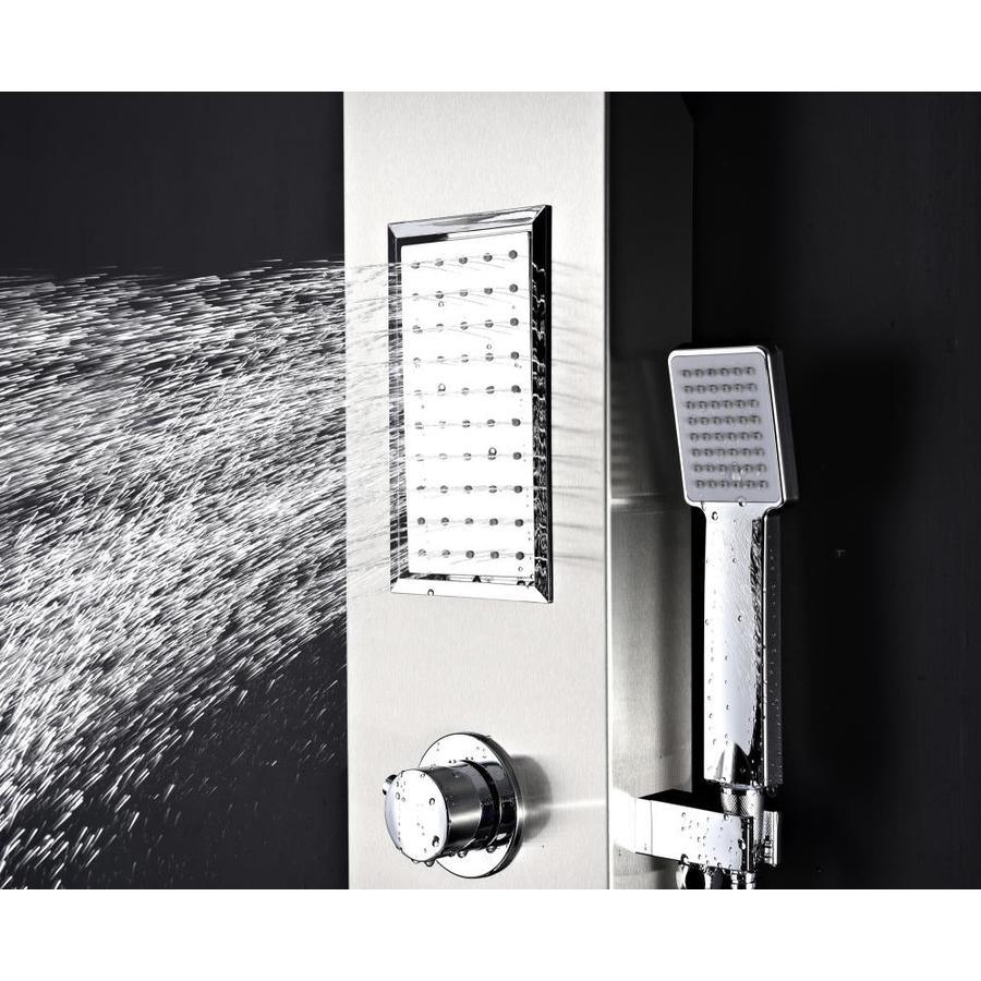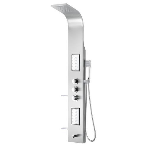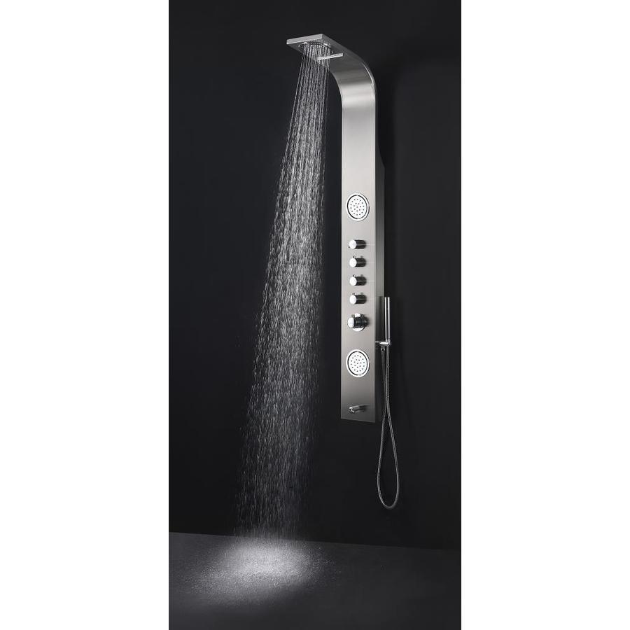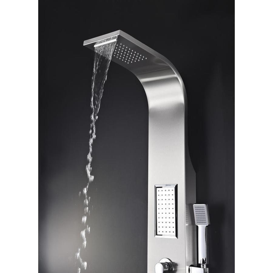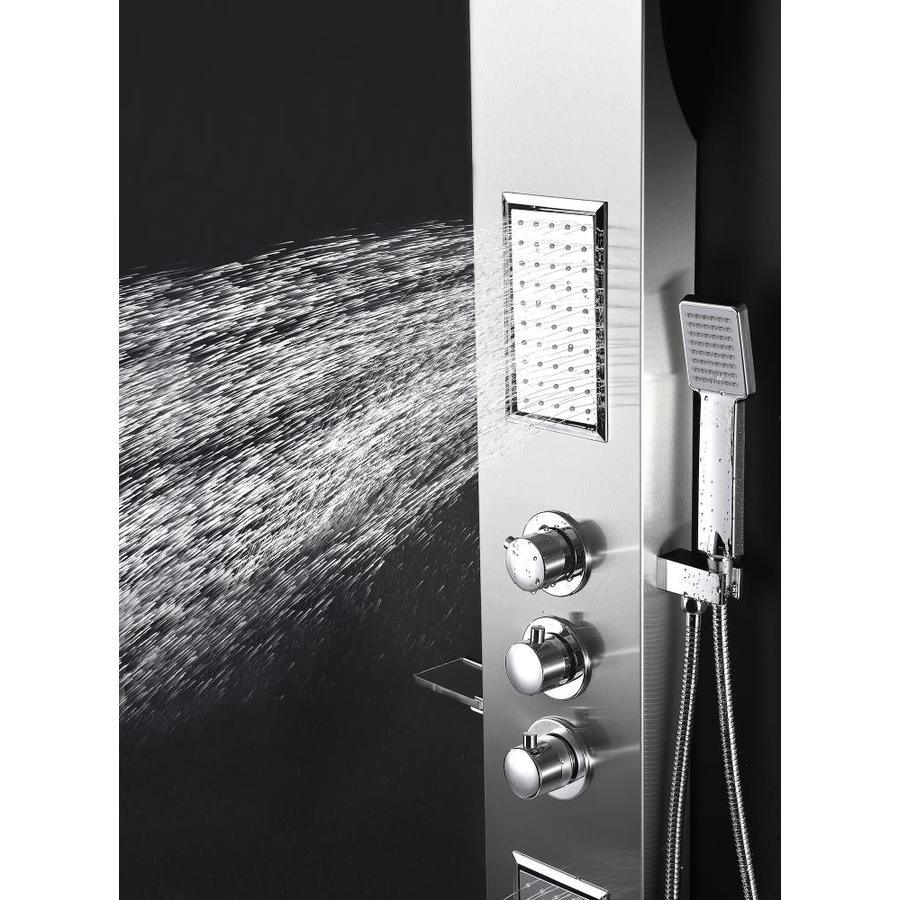 Includes one (1) Field full body shower panel with dual level deco-glass shelfs, one (1) Heavy Rain shower head with cascading waterfall, two (2) Acu-Stream directional body jets, one (1) euro-grip hand sprayer, one (1) owner's manual