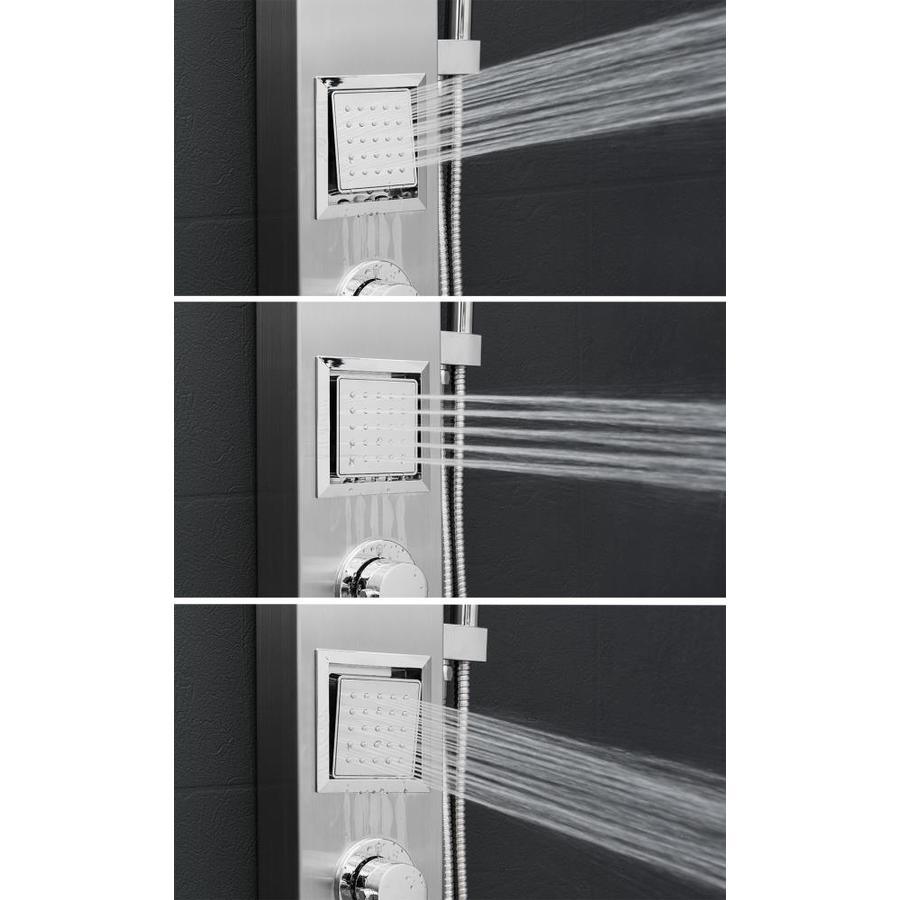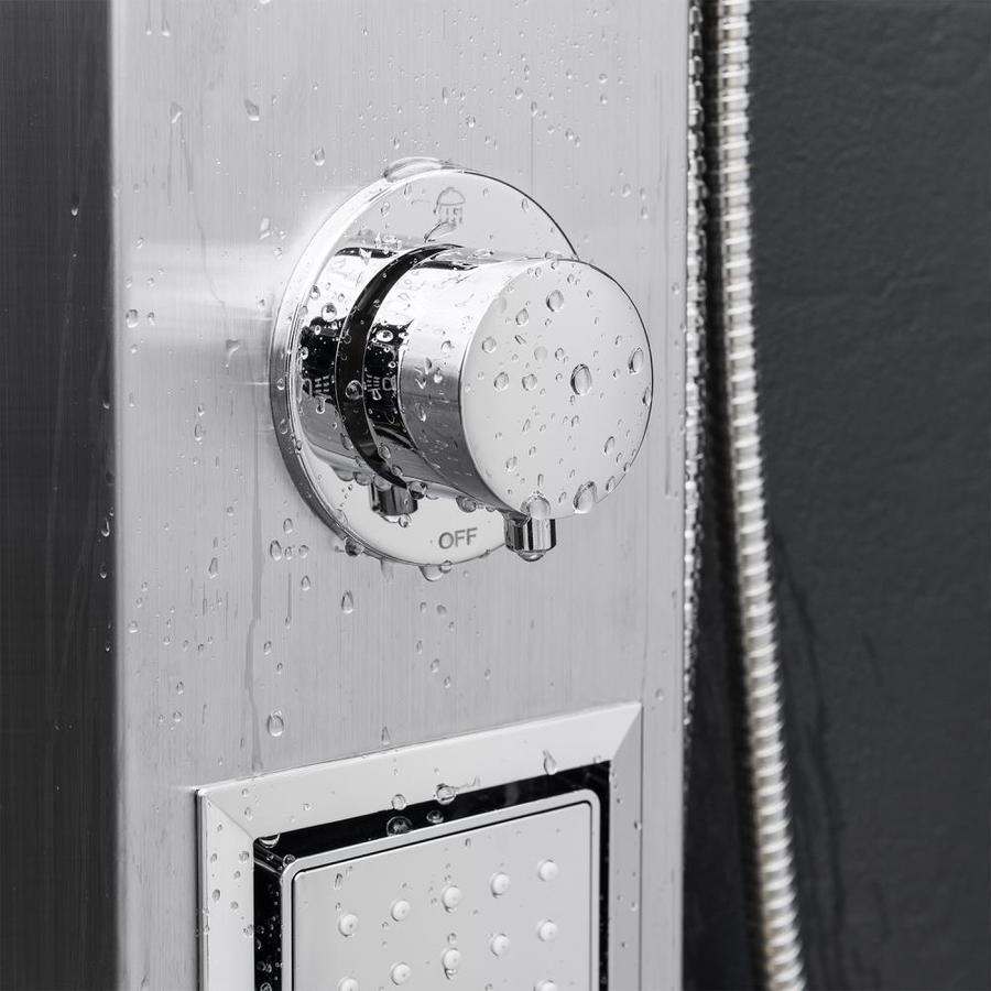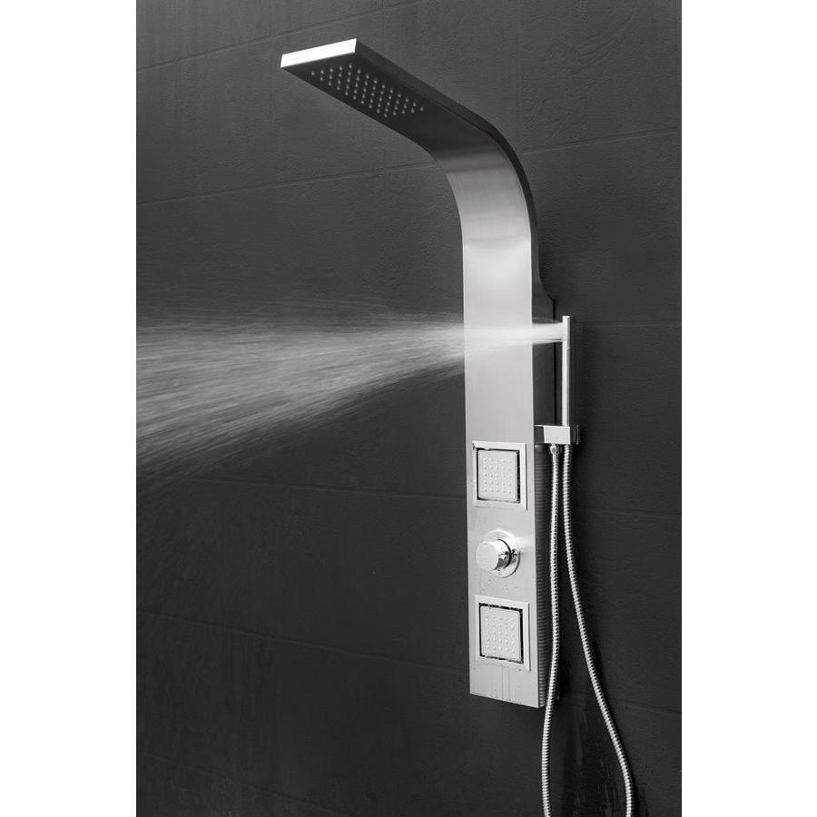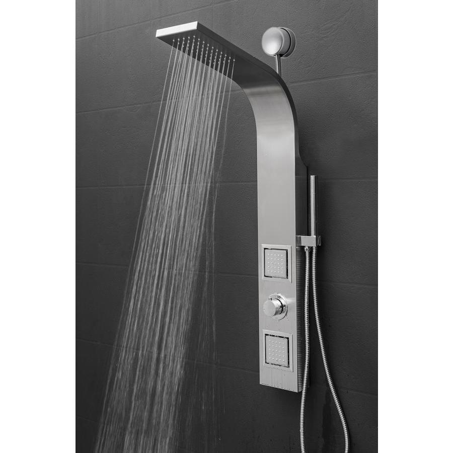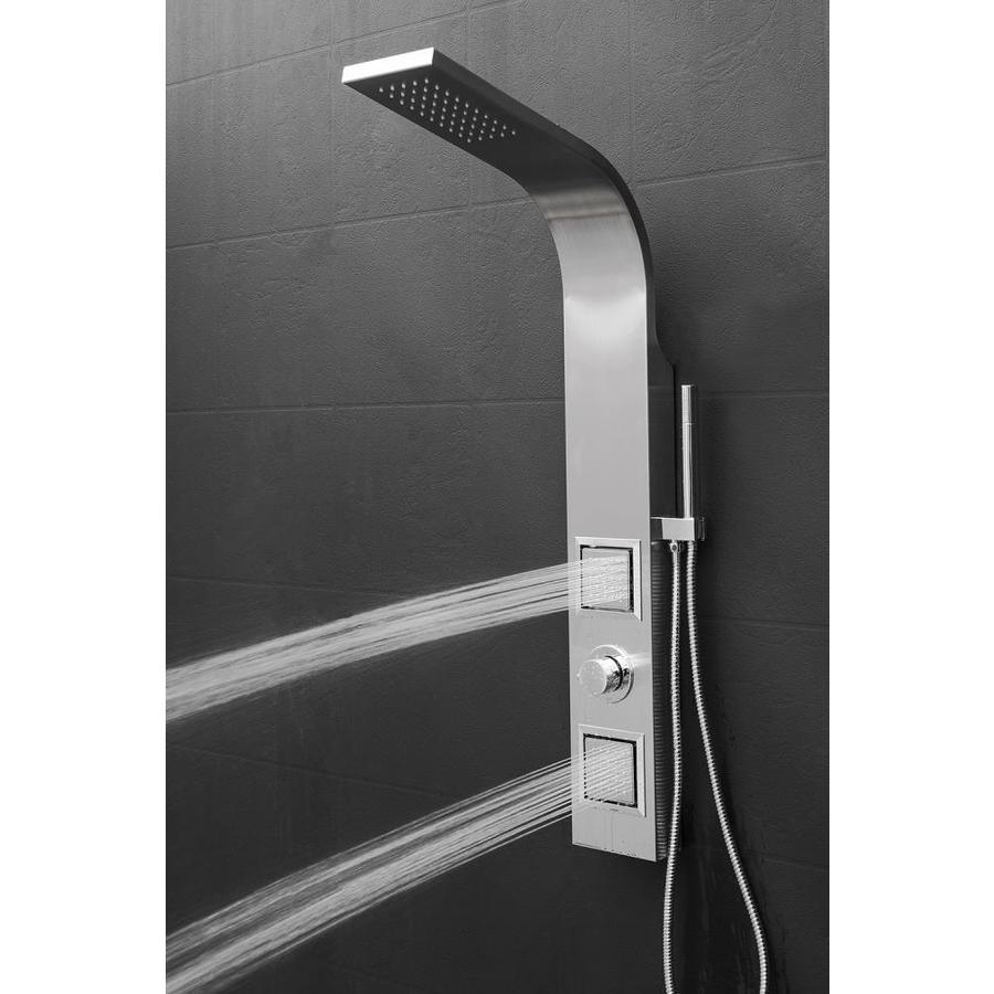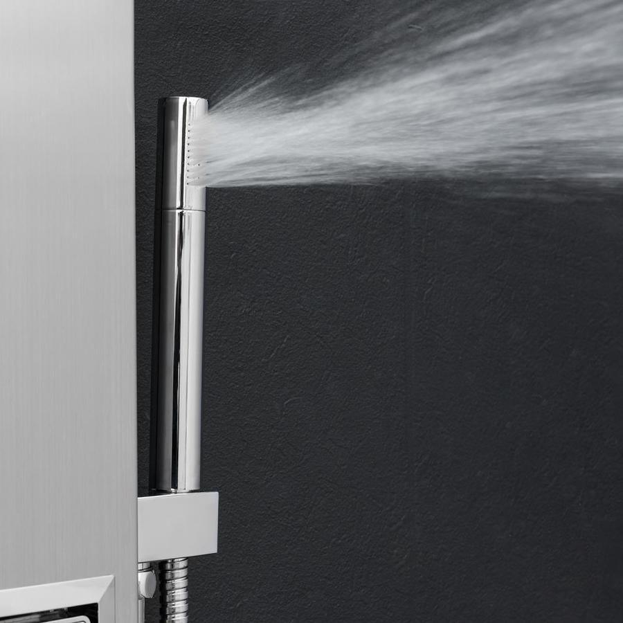 Slimline luxury shower panel has built-in rainfall showerhead, high-powered body spray jets, and high-efficiency handheld shower wand