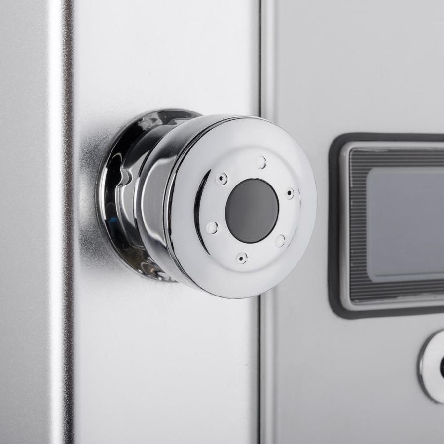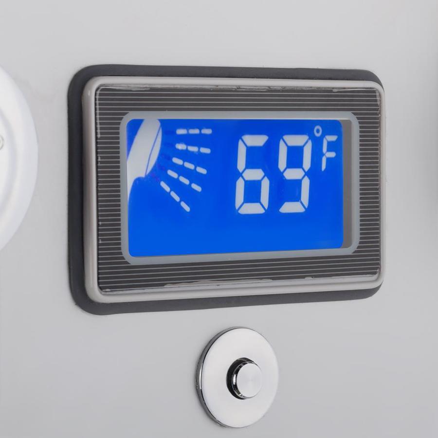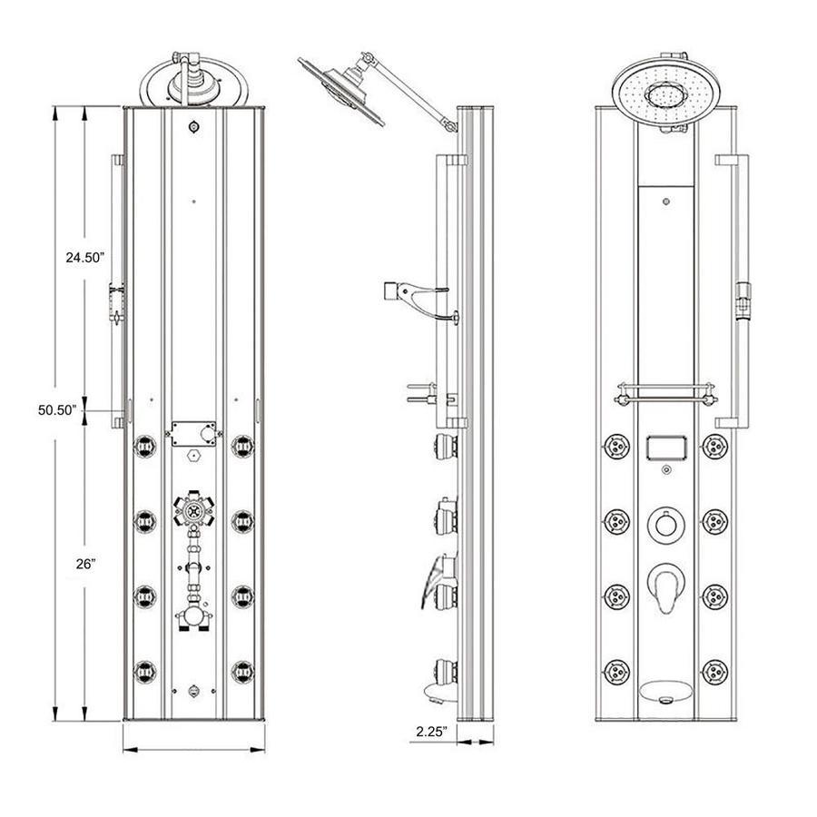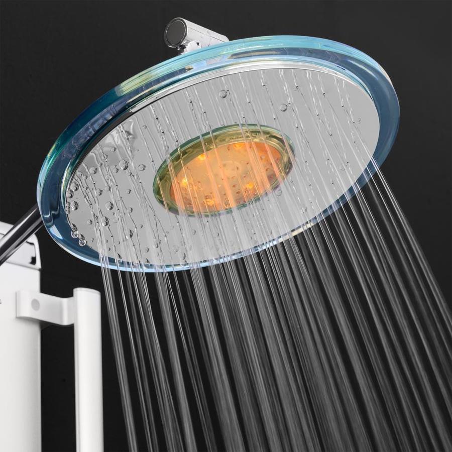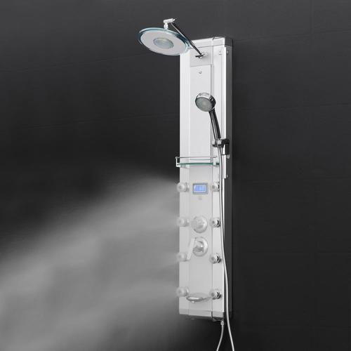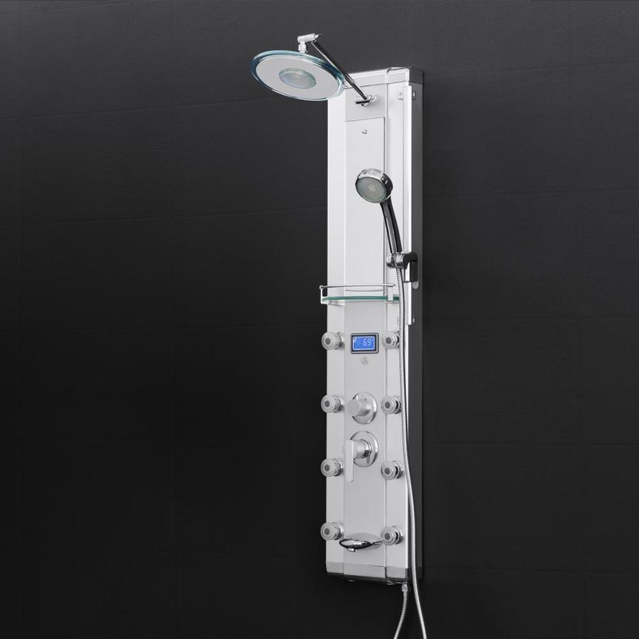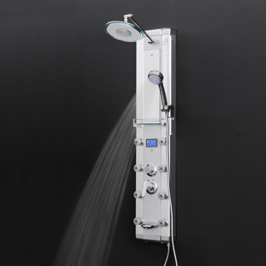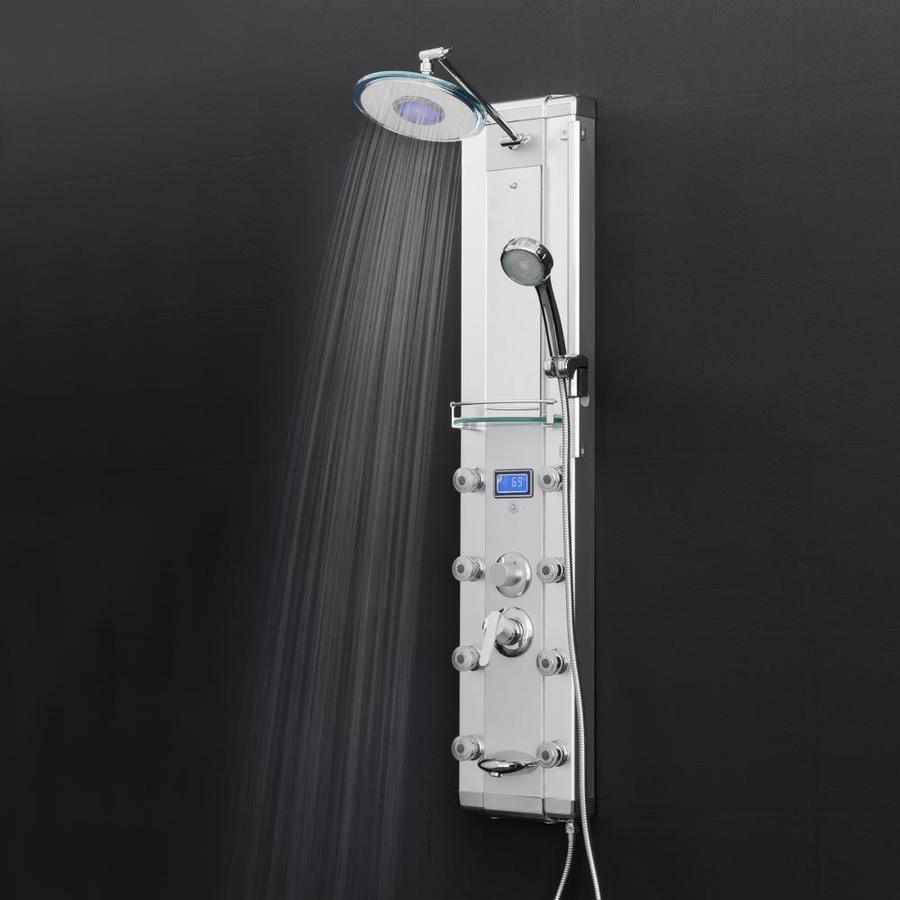 Slimline luxury shower panel has built-in LED overhead rainfall showerhead, adjustable high-powered body massage jets, tub spout and high-efficiency LED handheld shower wand and mirror
