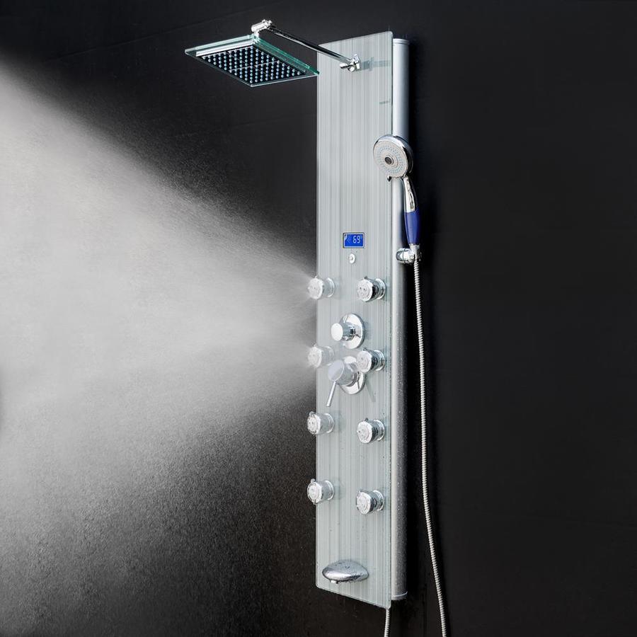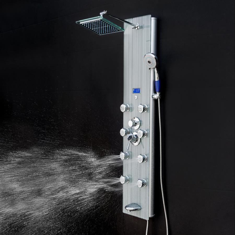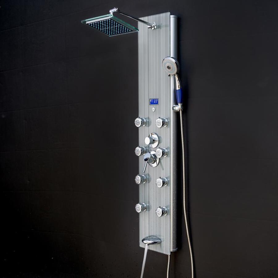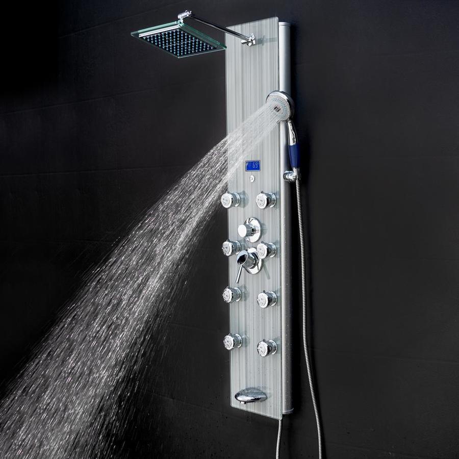 Slimline luxury shower panel has built-in LED temperature display, overhead rainfall showerhead, adjustable high-powered body massage jets, tub spout and high-efficiency multi-function handheld shower wand