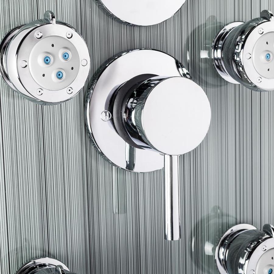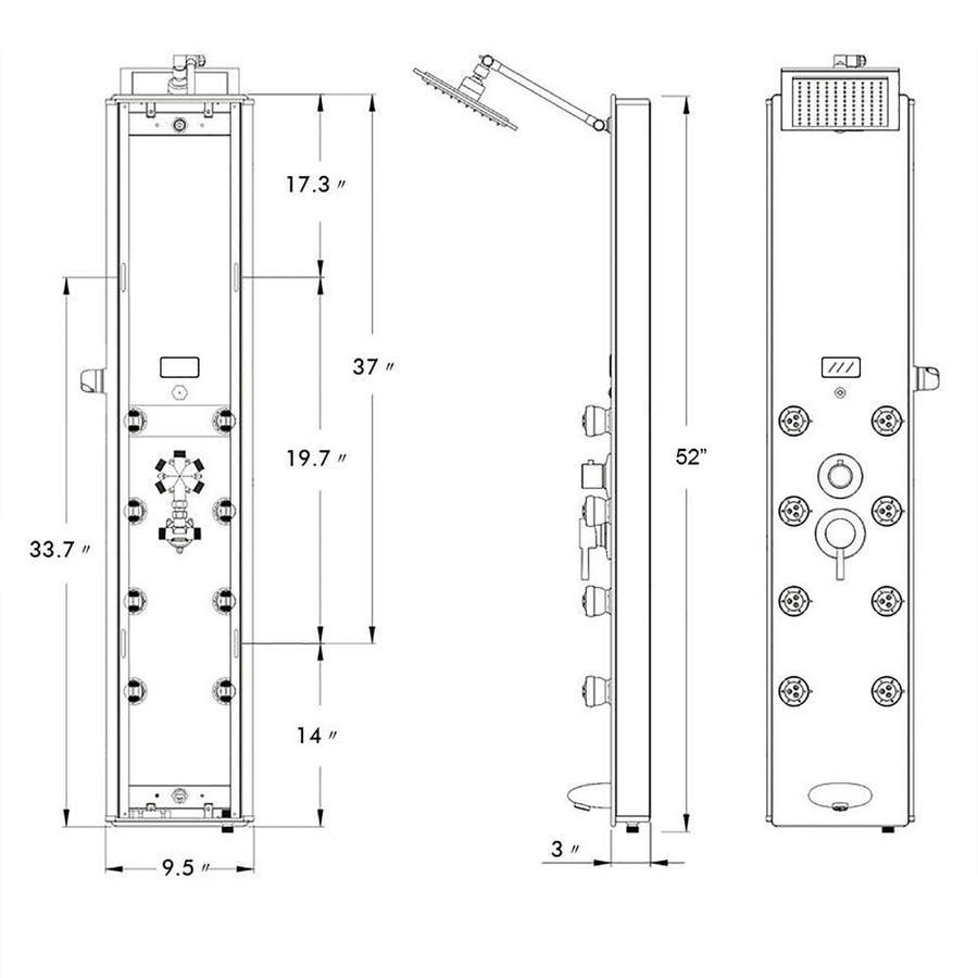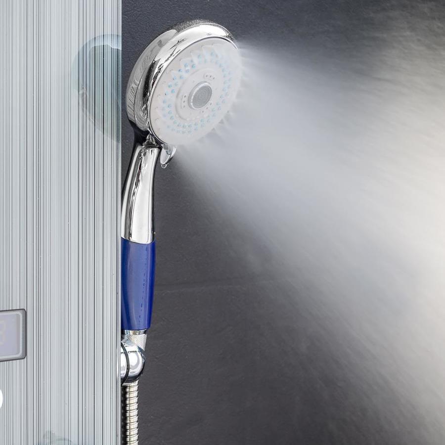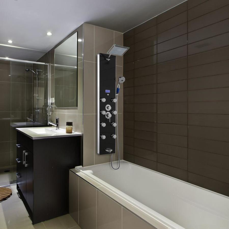Slimline luxury shower panel has built-in LED temperature display, overhead rainfall showerhead, adjustable high-powered body massage jets, tub spout and high-efficiency multi-function handheld shower wand