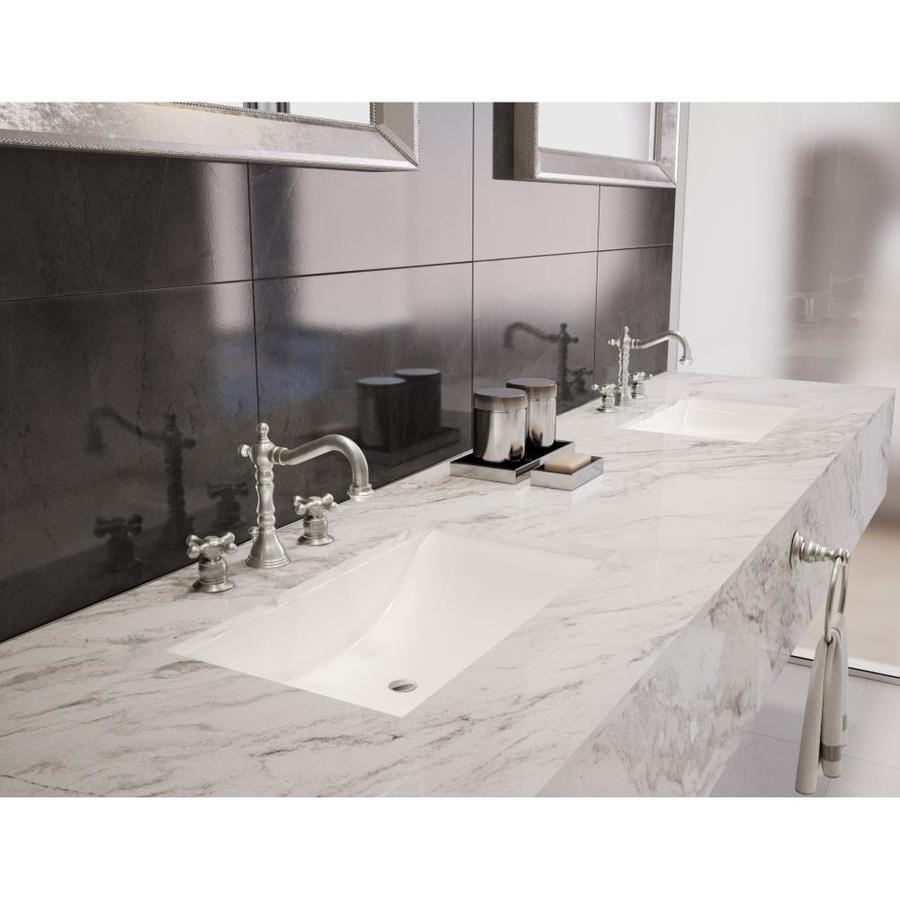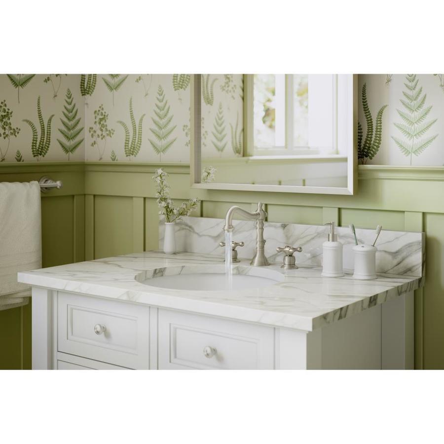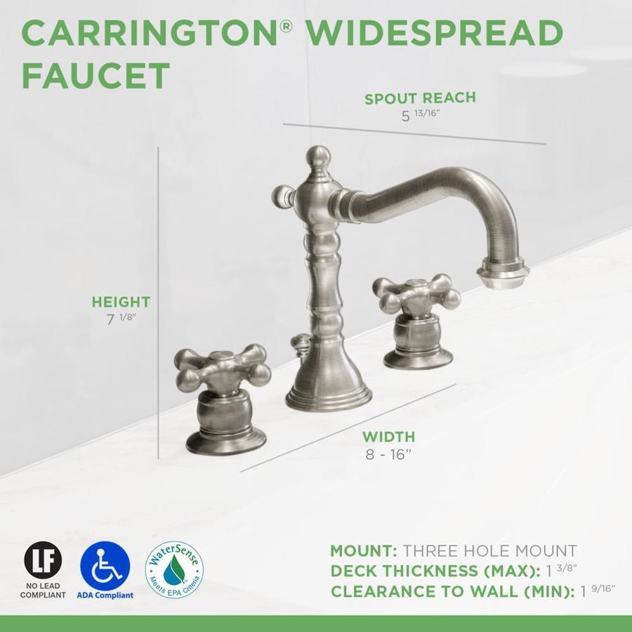 Carrington two handle widespread lavatory faucet 8-16-In widespread mount Quarter turn ceramic cartridge valves included 1/2-In IPS inlet connections Metal pop-up drain assembly with lift rod ADA compliant brass handles for ease of use No lead compliant Braided supply hoses Constructed of brass, bronze, stainless steel and plastic
