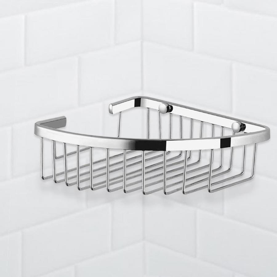 Corner shower basket Polished chrome finish Made out of brass Mounts to wall with screws Easy installation From the Nameeks general hotel collection