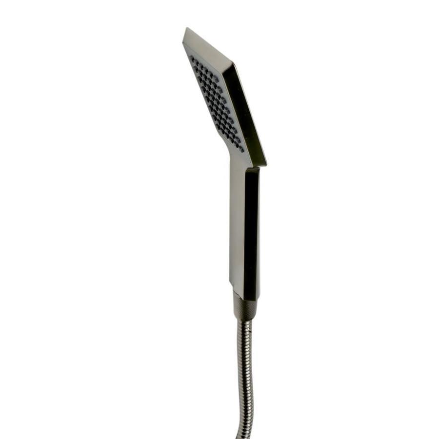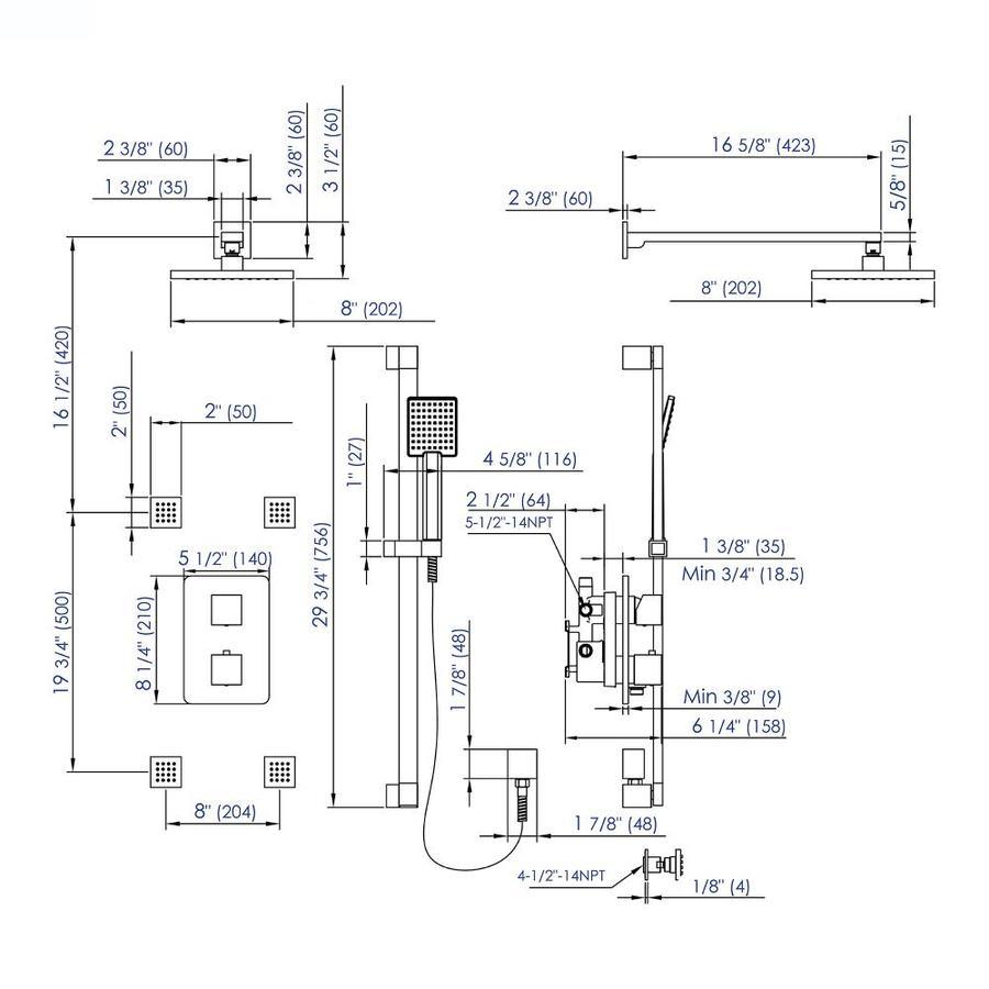 This complete shower set includes: Water Diverter, Temperature Control, On/Off Control, Rain Showerhead, Handheld Showerhead, 4 body sprays Modern square knobs, showerheads, and body sprays Wall Mount installation Expertly crafted solid brass construction for long-lasting durability Coated with a Polished Chrome or Brushed Nickel finish User-Friendly installation UPC logo of authenticity etched on the faucet