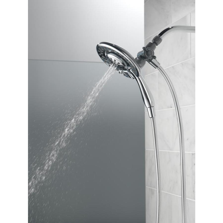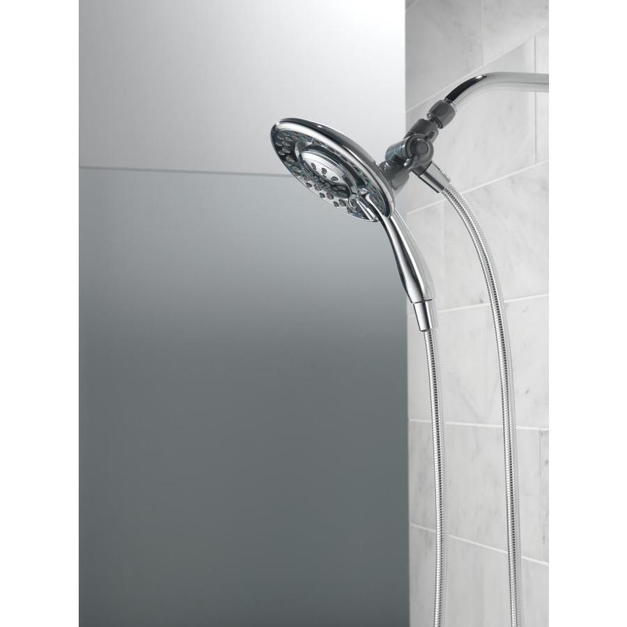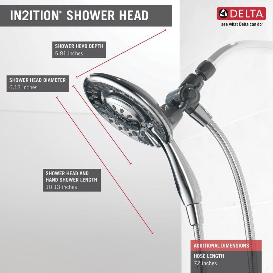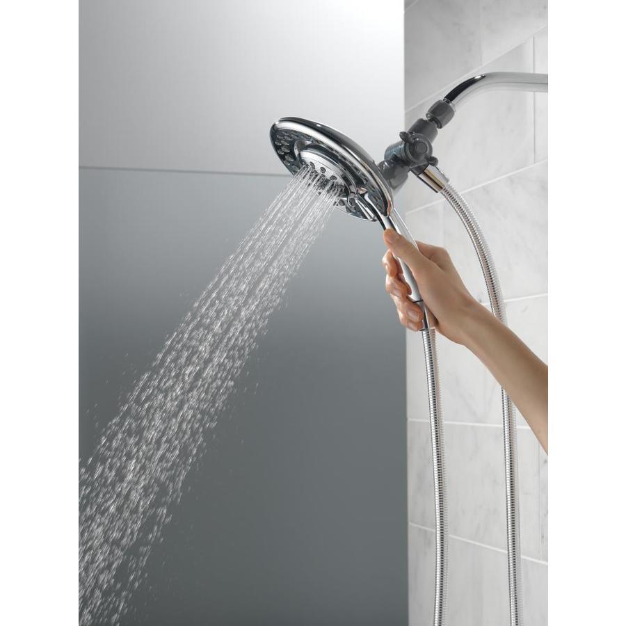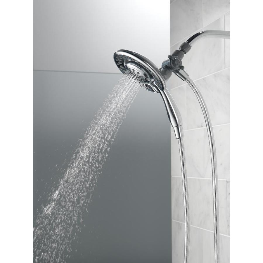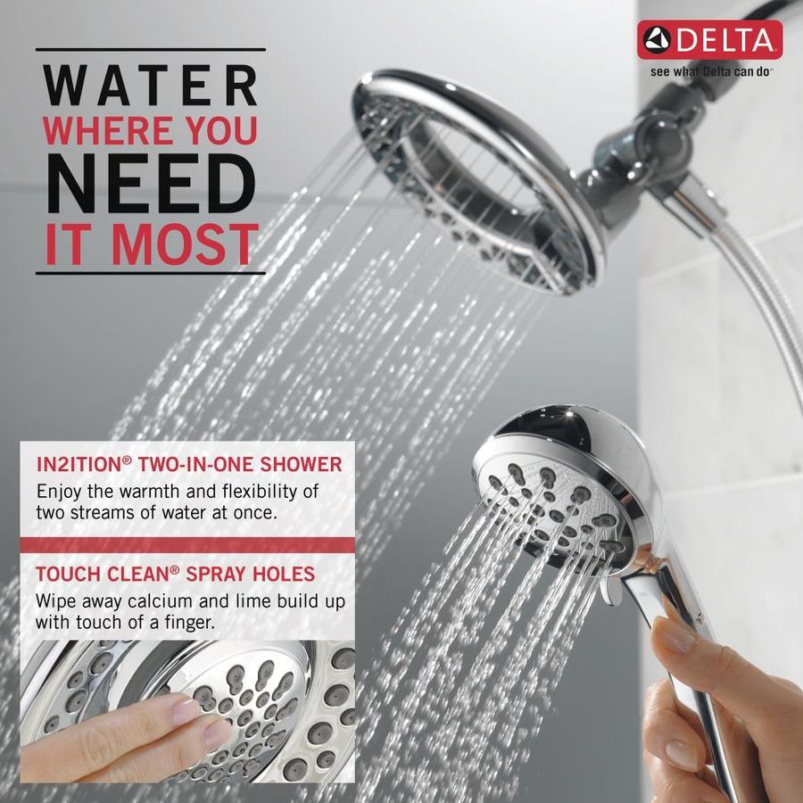 The In2ition® Two-in-One Shower gets water where you need it most using the integrated shower head and hand shower separately or together Perfect for bathing loved ones and pets as well as keeping the inside of your shower and tub clean Soft, rubber Touch-Clean® spray holes allow you to easily wipe away calcium and lime build-up from the spray face of your shower head and hand shower with the touch of a finger Installs in minutes Spray settings include: Full Body spray, Full Spray with Massage, Massaging spray Pause feature reduces water to a trickle, giving you space for shaving, lathering and other shower tasks while maintaining your temperature settings Includes 60-in hose WaterSense® labeled showers use at least 20% less water than the industry standard—saving you money without compromising performance