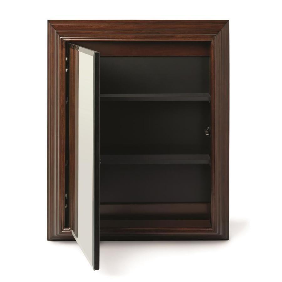 The 22.5 In. x 27.5 In. surface mount wooden medicine cabinet in brown is a simple and stylish way to give your bathroom a warm and elegant look Durably constructed with beveled mirror and wood frame in brown color finished This cabinet has 2 adjustable glass shelves for storage of various sized items