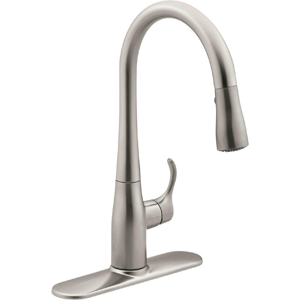 An innovative fit for a variety of kitchens and tasks, this Simplice bar or prep sink pull down kitchen faucet combines an elegant, universal design with exceptional ergonomics and functionality. The high-arc swing spout rotates 360°, while the smoothly maneuvering spray head pulls down into the sink for up-close tasks, or out of the sink to fill pots. Sculpted buttons on the spray head ensure simple operation even with wet, soapy hands.