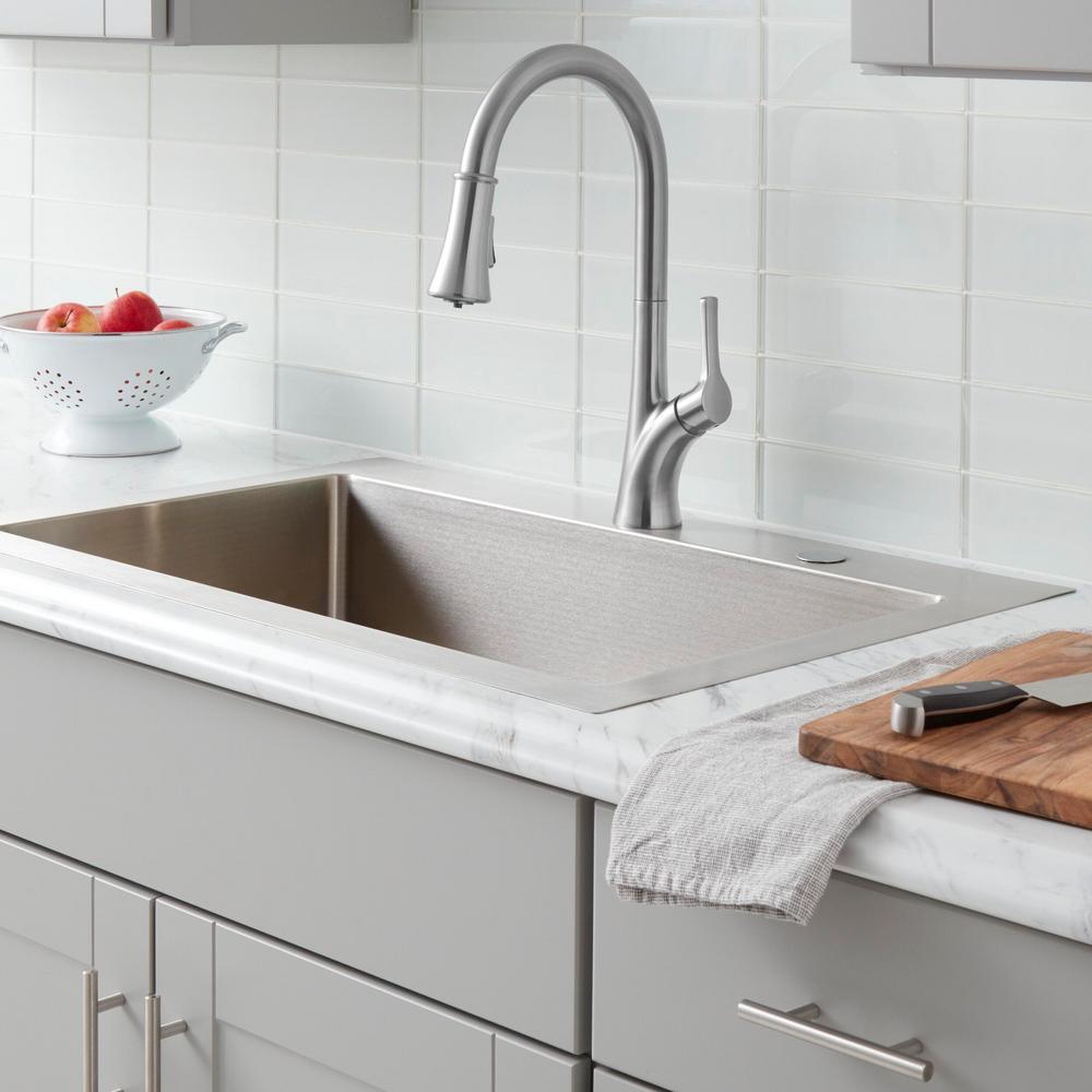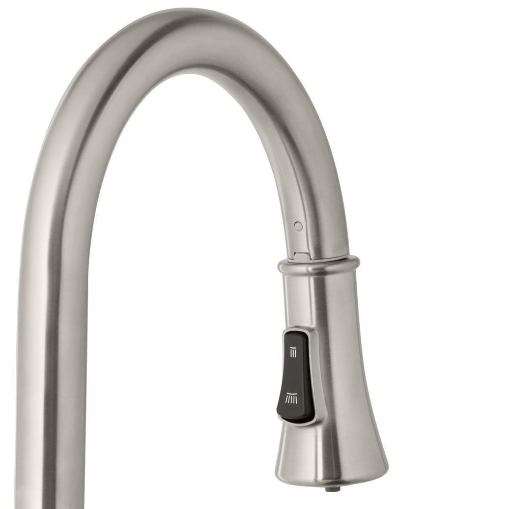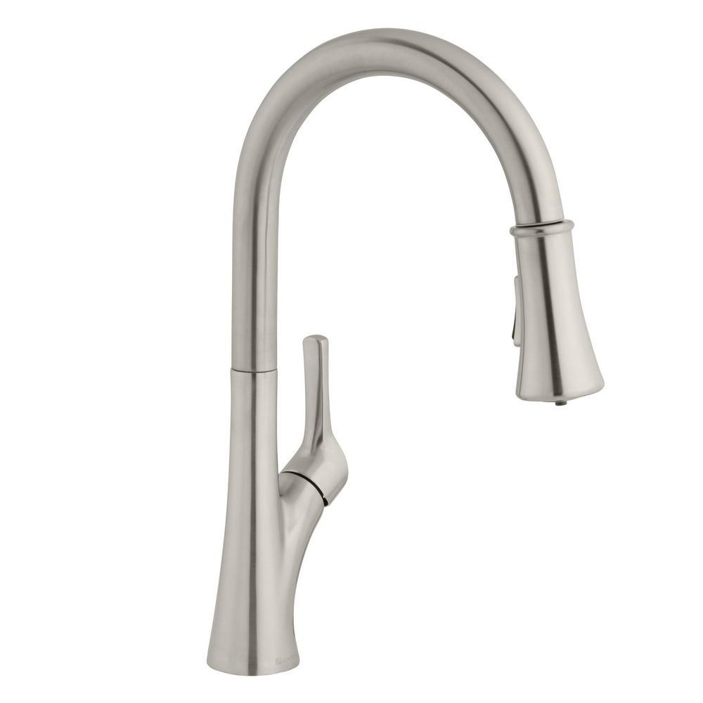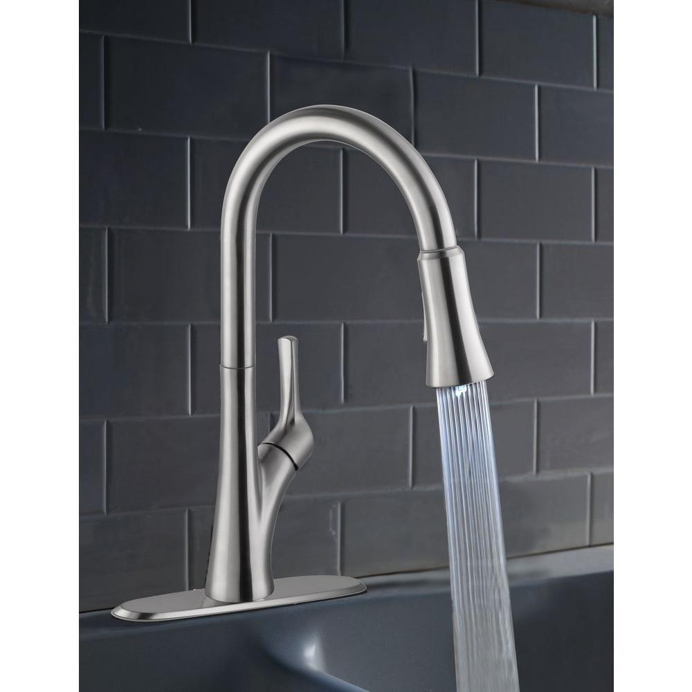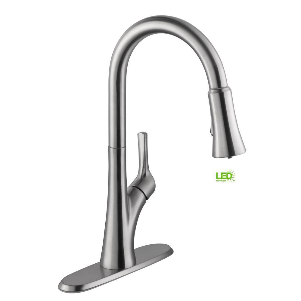 This Single-Handle Pull-Down Sprayer Kitchen Faucet with LED Light in Stainless Steel is a great addition to any kitchen decor. Easy-to-use single handle for precise water control, this faucet has a high arc for ample sink clearance and a pull-down sprayer with plenty of reach for clearing the sink, rinsing dishes or filling pots and pans. The pull-down spray head also includes a water powered LED light, that provides an added cleaning solution to meet all your faucet needs. Faucet can be installed with or without included deck-plate.