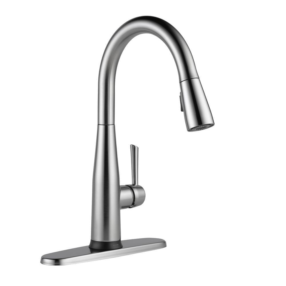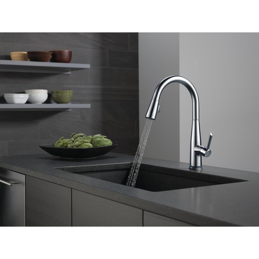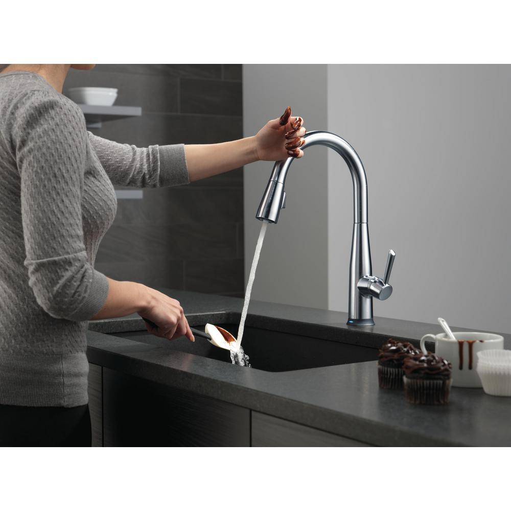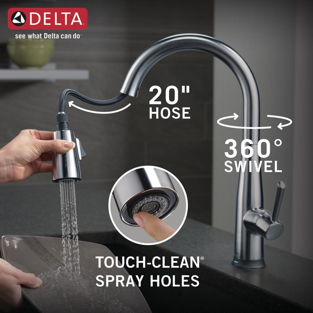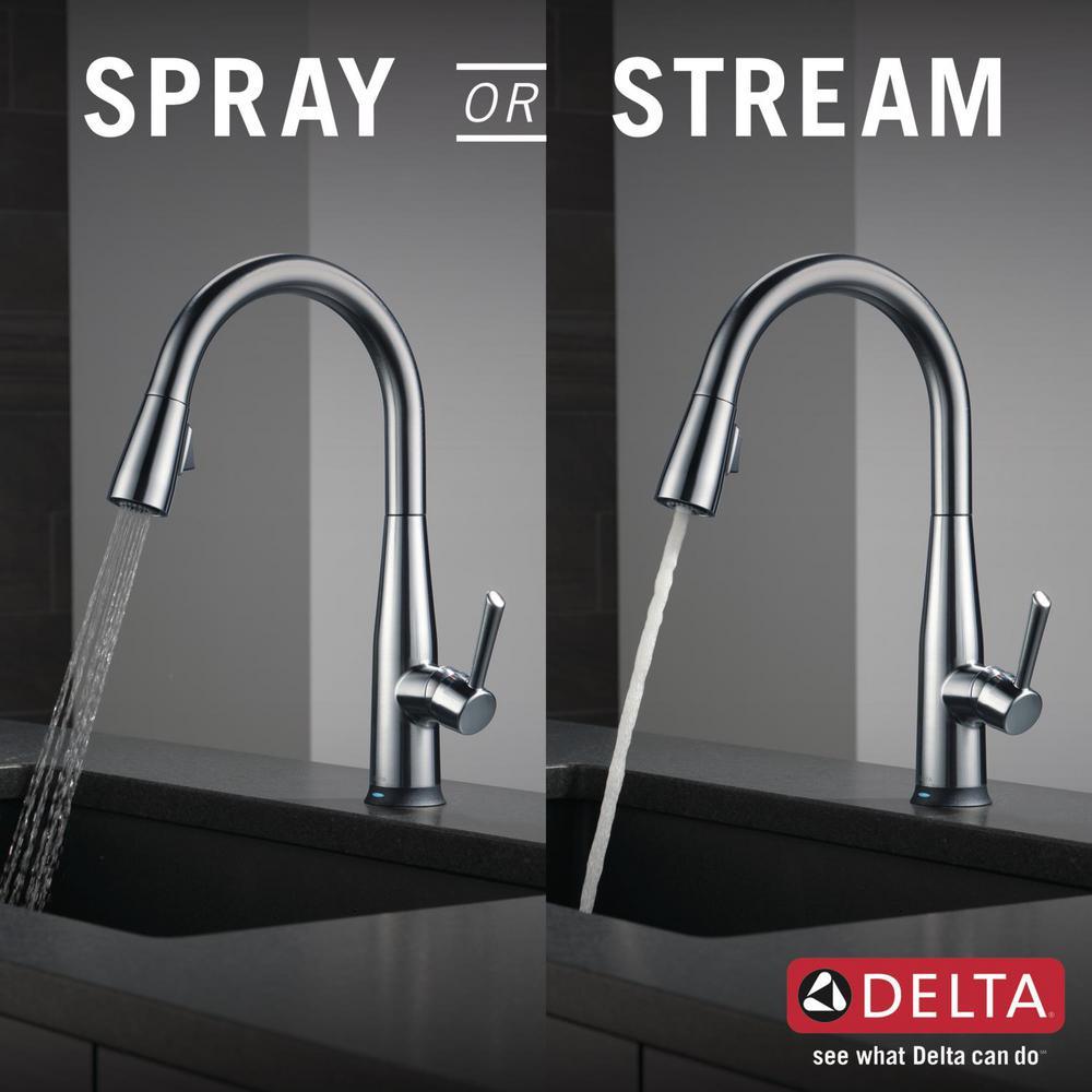 This Essa Touch2O Technology Single-Handle Pull-Down Sprayer Kitchen Faucet in Arctic Stainless with MagnaTite Docking features a soft contemporary take on a euro design, with contemporary and transitional elements. Thoughtfully designed to make kitchen tasks easier, Touch2O Technology allows you to turn the faucet on and off with just a touch anywhere on the faucet's spout or handle. Easily control and change the water temperature above the deck using the faucet handle. TempSense Technology measures the water temperature in the faucet. The LED light at the base of the faucet changes from blue to magenta to red depending upon the temperature of the water to let you know when the water temperature is right for you. A/C adapter EP73954 is available to purchase separately as an option to avoid changing batteries. Even if the adapter is used, batteries are still recommended as a back-up if power goes out. Once power is restored, the solenoid valve will automatically revert back to using A/C power. The pull-down spray wand comes free with a gentle tug and is fed by gravity to extend and retract without friction points. As you raise the wand to dock it, the magnet embedded in the spout pulls the wand precisely into place. MagnaTite keeps your pull-down faucet looking picture-perfect. Delta's exclusive DIAMOND Seal Technology uses a valve with a tough diamond coating.