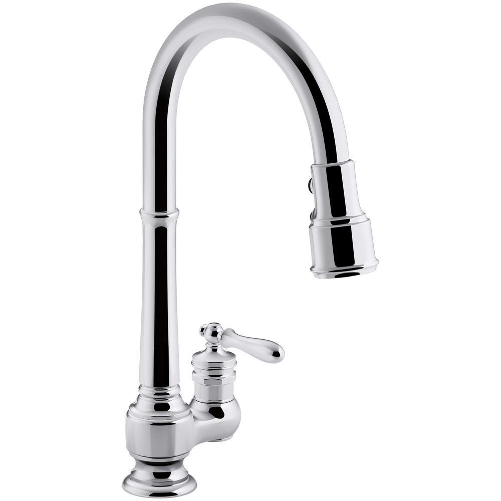 The Artifacts faucet collection brings you classic designs reimagined in fresh new ways for various task areas of the kitchen. This Artifacts kitchen sink faucet displays vintage style with its high-arch spout and unique handle position, which eliminates interference with backsplashes. The three-function pull-down spray head has you covered for a range of tasks: BerrySoft spray for food prep; an aerated stream for filling pots; and Sweep spray for cleaning.