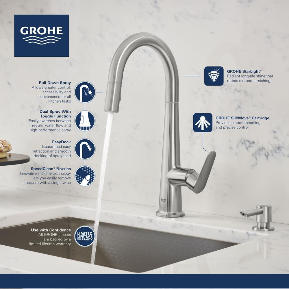 Sleek, elegant and unabashedly minimalist, the GROHE Veletto pull-down faucet with soap dispenser in Chrome cuts a dramatic figure in any modern or transitional-style kitchen. As functional as it is visually striking, the faucet offers smooth, precise control of the water temperature and volume, thanks to a side lever handle equipped with a GROHE SilkMove cartridge, and a gooseneck swivel spout with 360° rotation. The spout incorporates a pull-down spray head featuring 2-spray functions stream and spray and GROHE SpeedClean nozzles that resist lime scale buildup. The GROHE StarLight Chrome finish will neither tarnish nor scratch, retaining its brilliance through a lifetime of use.