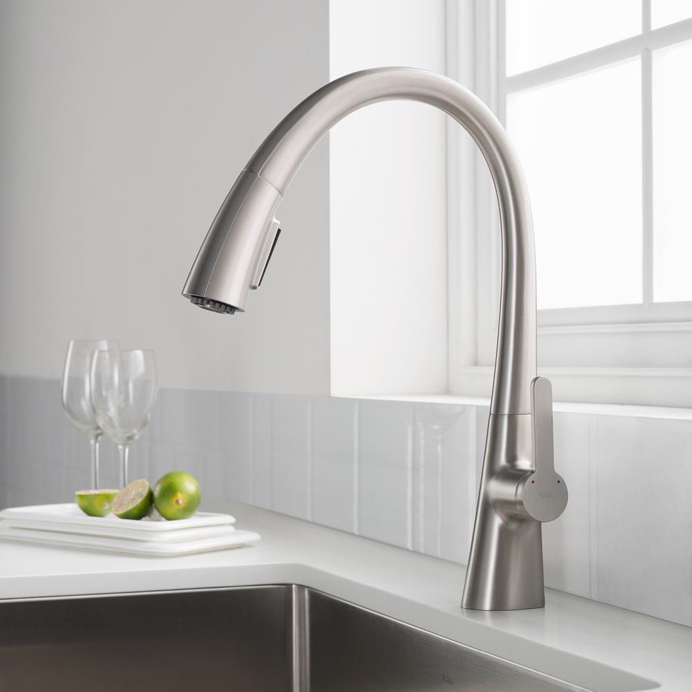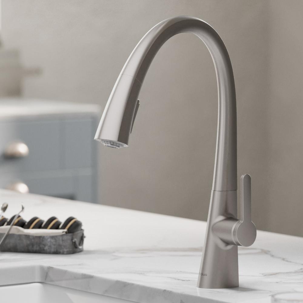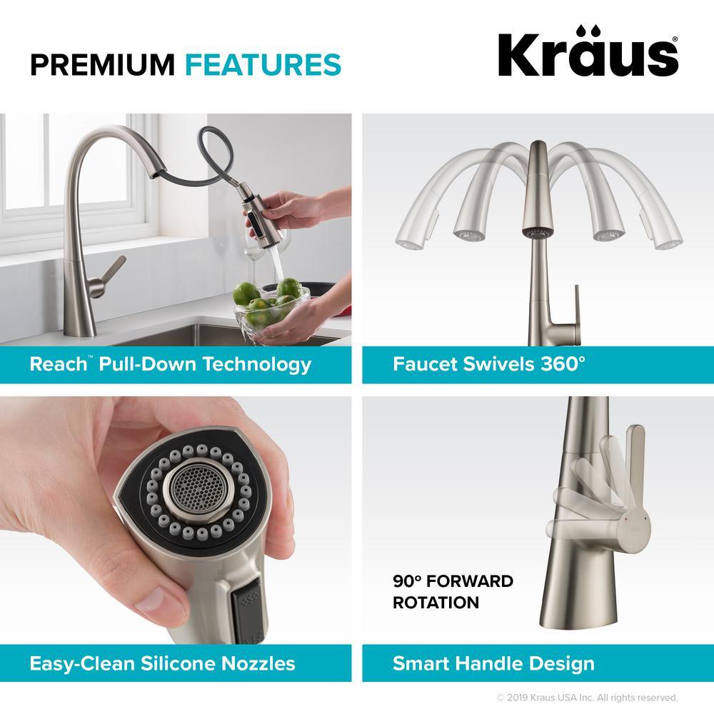 • Pull-down system with reach technology: state-of-the-art spout, swivel sprayhead connector, and counterweight offer frictionless performance; sprayhead moves effortlessly to flex, pivot, stretch, and easily glide back into the spout