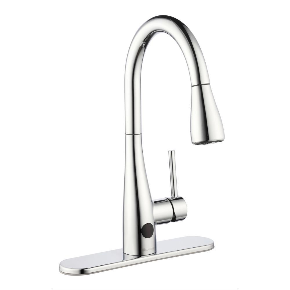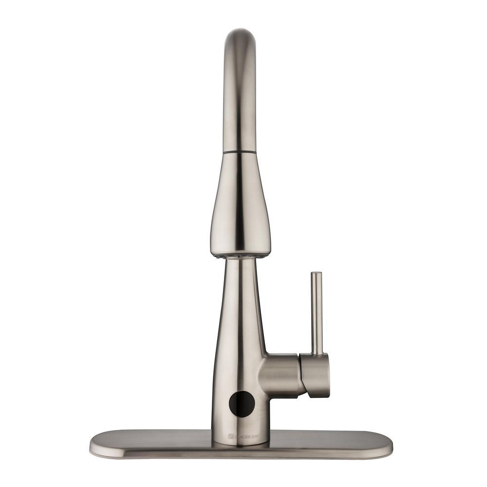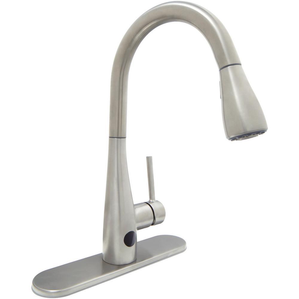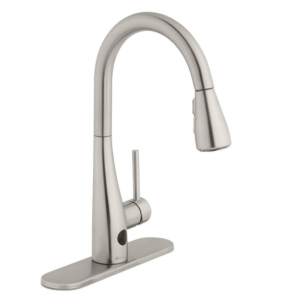 This Glacier Bay Nottely Single-Handle Pull-Down Sprayer Kitchen Faucet boasts an intuitive, battery-powered sensor that enables hands-free use to help reduce spreading bacteria. This innovative kitchen faucet is equipped with the powerful TurboSpray setting for your toughest cleaning tasks. The exclusive feature provides focused water columns with 30 percent more power than standard pull-down faucets. This single-handle kitchen faucet enables easy and precise water temperature control, while providing a 1.8 GPM flow rate for outstanding water flow. Its ceramic disc cartridge ensures drip-free performance. Get ample kitchen space from its high-arc spout and a modern look with its stainless steel finish and curved minimalist design. Installation is quick and easy with this kitchen faucet’s FastMount system.