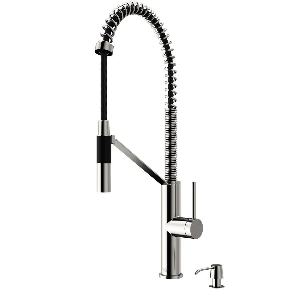 With its sleek design and modern spiral details, the VIGO Livingston Magnetic Kitchen Faucet is the perfect functional fixture for your kitchen. The single handle kitchen faucet features a professional look with an easy to clean spray face. The pull-down spray head switches from aerated flow to spray at the touch of a button for powerful cleaning. An integrated magnetic catch holds the spray head in place when not in use for additional convenience. A matching soap dispenser with an above-counter pump and below counter 10 ounce reservoir offers is included in this set.