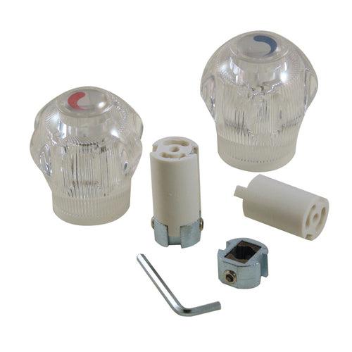 Durable clear acrylic construction also provides reliability Versatile design includes adapters to fit a variety of faucet fixtures Clear design gives a freshed look that will match moth bathroom fixtures Includes adapters, spacers and Allen wrench Spacers can be placed on top of the adapter to prevent handle from installing to close and scraping the handle flange if needed Included in packaging are a pair of handles 1-9/16 inch diameter at base; 3 inch overall height Easy to install with little tools required