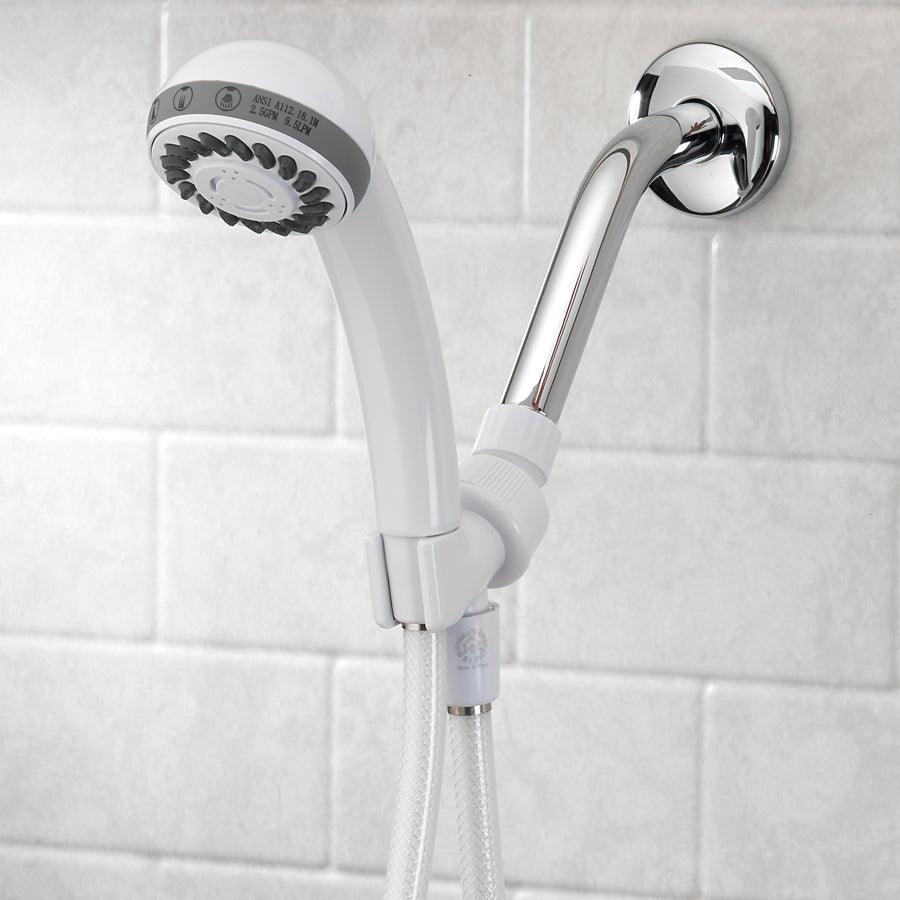 White AquaSource handheld shower head Self cleaning rubber nozzles reduce clogging Delivers diverse, versatile streams suited to your personal preference Includes 3 spray settings WaterSense certified maximum flow rate of 1.8 GPM (6.8 LPM) Water conserving shower massage showerhead Easy installation PTFE tape included Covered by a limited lifetime warranty