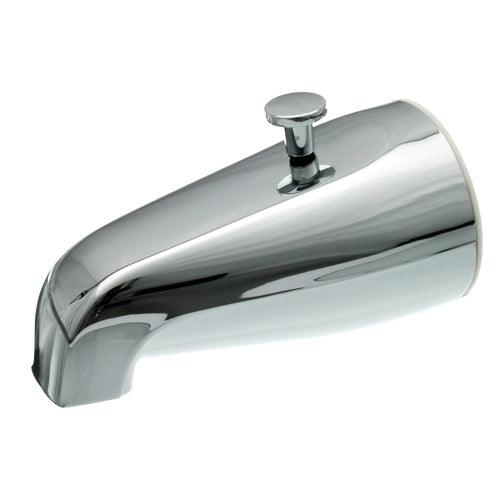 Versatile design: this versatile design is easily compatible with majority of faucet brands Connection size: the spout is compatible with 1/2 in. or 3/4 in. IPS connections Diverter included: the tub spout includes a back diverter that will allow water to flow both downward into the tub and upward into the showerhead Tub spout reach: the bathtub faucet spout has a 5 in. reach Built to last: the durable metal construction provides strength, longevity and endurance for the rigors of everyday use Hassle-free installation: you will need pipe thread tape, a flat head screwdriver, adjustable pliers and a Phillips screwdriver Chrome finish resists corrosion and tarnishing while creating a bright, refreshing feel for your bathroom
