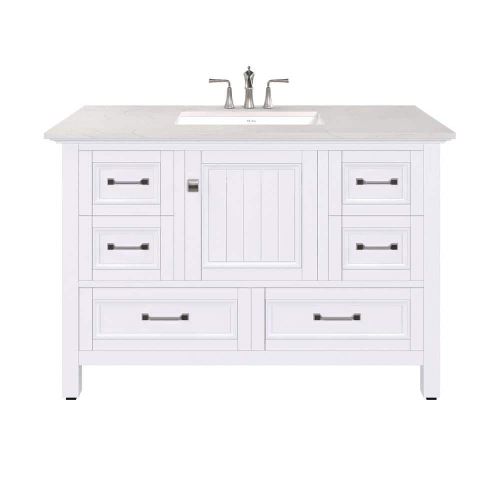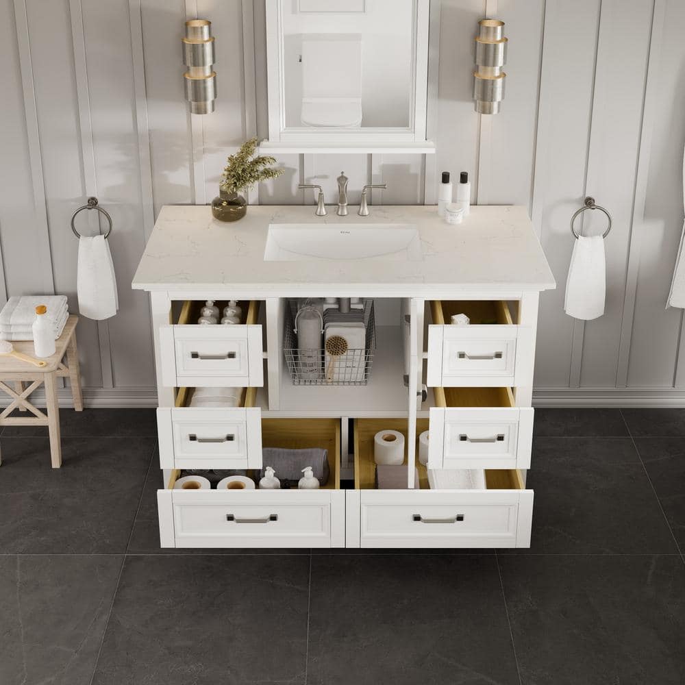 The Eviva Britney 42" Bathroom Vanity combines timeless elegance with practicality, featuring a lustrous Carrara quartz top and a seamless undermount porcelain sink. Its durable solid wood construction and soft-close drawers ensure longevity and quiet functionality, making it a centerpiece of style and convenience in your bathroom.