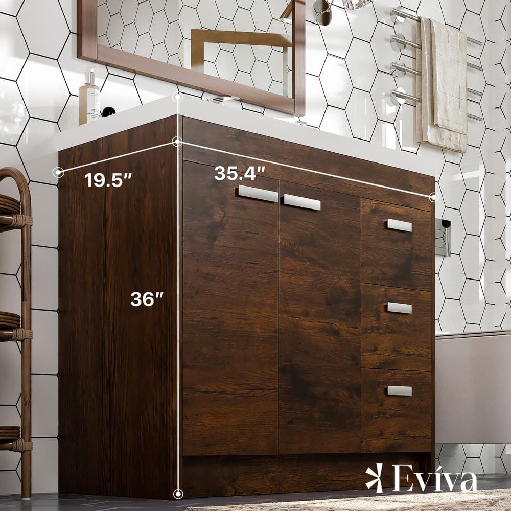 Elevate your bathroom with the Eviva Lugano 36-Inch Bath Vanity in Rosewood, featuring a sleek white acrylic top with an integrated sink for modern elegance. Crafted from high-grade engineered wood, this vanity offers durability and a luxurious textured Rosewood finish. Its soft-closing drawers and doors ensure smooth functionality, while offering ample storage to meet your needs.