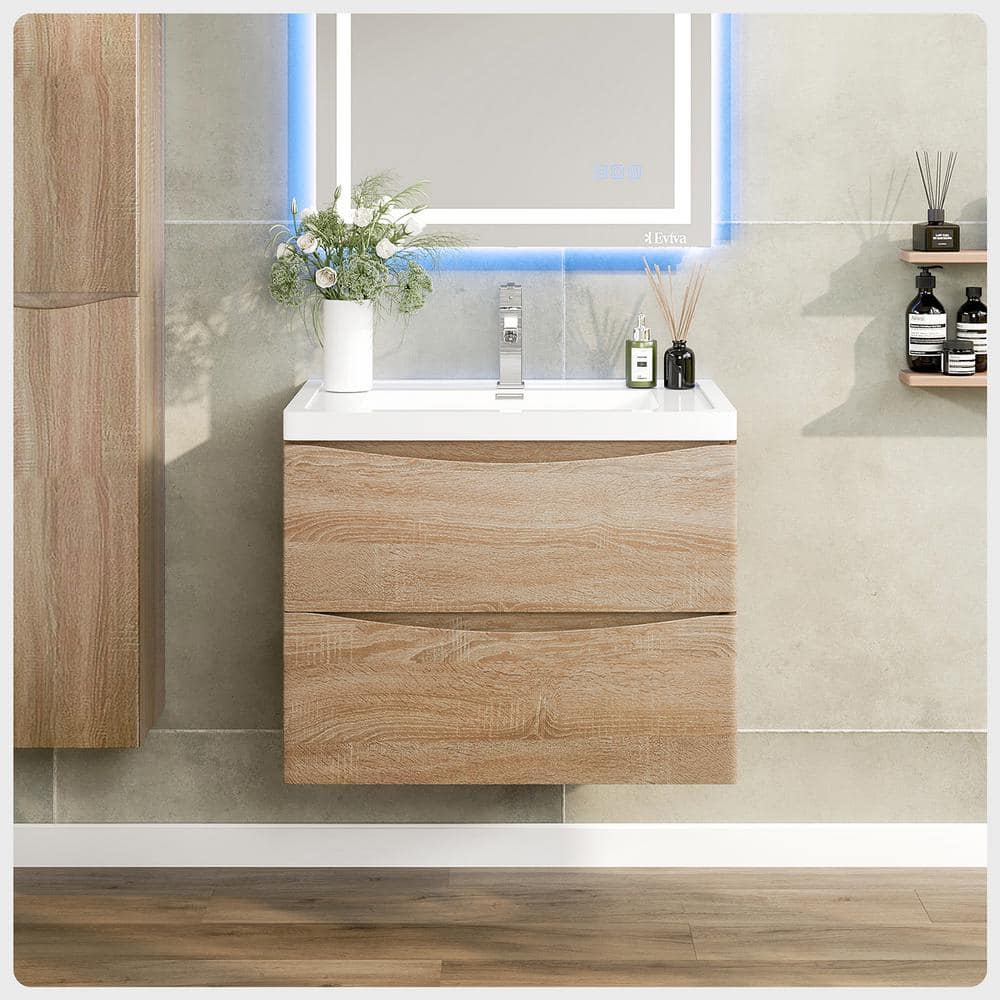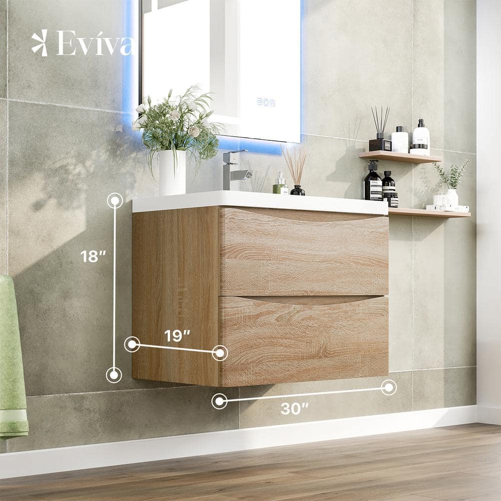 Upgrade your bathroom with the stylish Eviva Smile 30" Bath Vanity in White Oak. Featuring a stunning white acrylic top with an integrated sink, this modern vanity is designed for easy installation and offers soft closing drawers for a seamless look and feel.