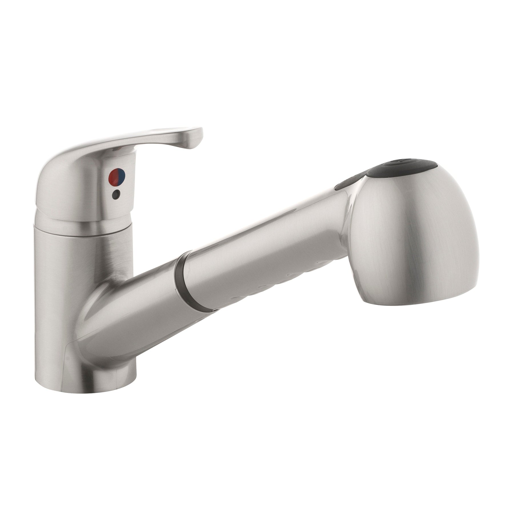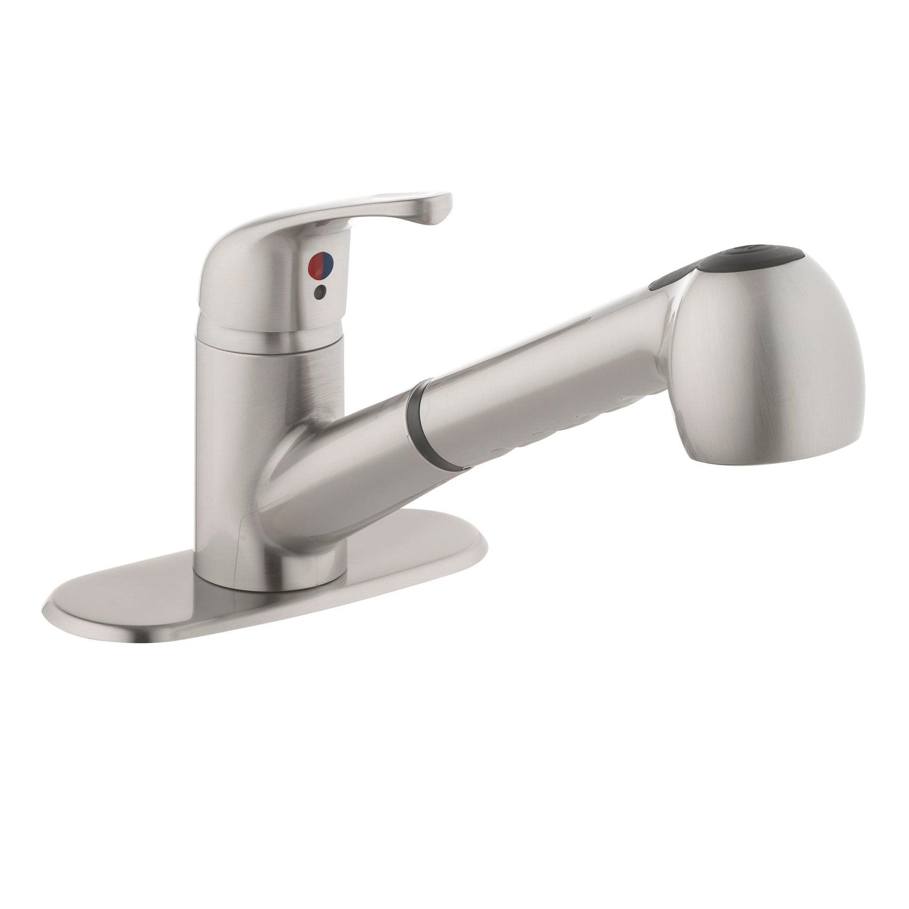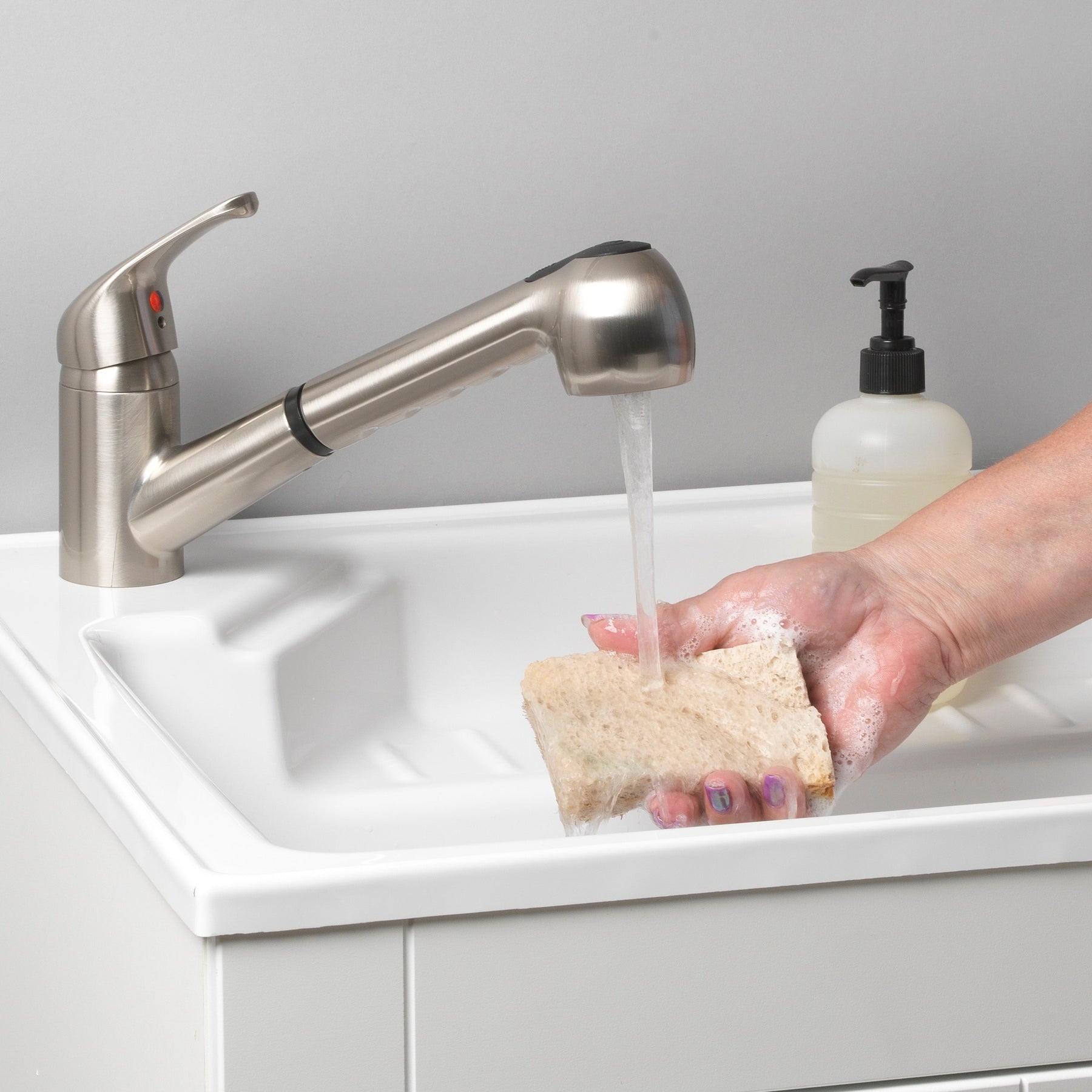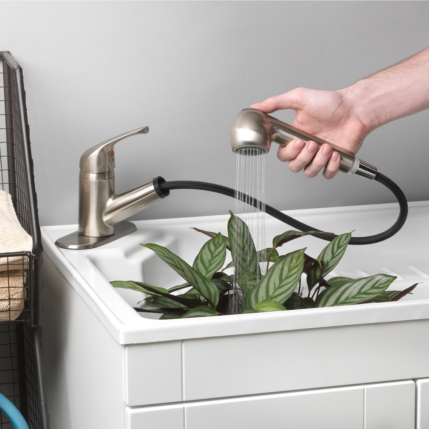 The Project Source Stainless Steel Utility Faucet with Pulldown Sprayer is engineered for efficiency and durability, featuring a sleek design and versatile spray settings. Its extendable nozzle and high flow rate make it ideal for both residential and commercial use, offering seamless water control for any utility task.
