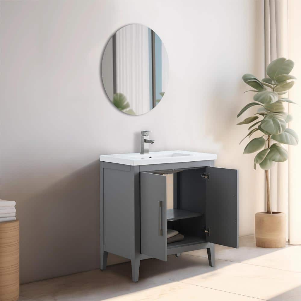 The Vanity Art 30-Inch Bathroom Vanity in Cashmere Gray combines sleek design with practical functionality. It features a durable ceramic countertop, a stylish undermount sink, and ample storage with adjustable shelves for your essentials. Ready to install, this vanity offers a sophisticated upgrade to any bathroom setting.