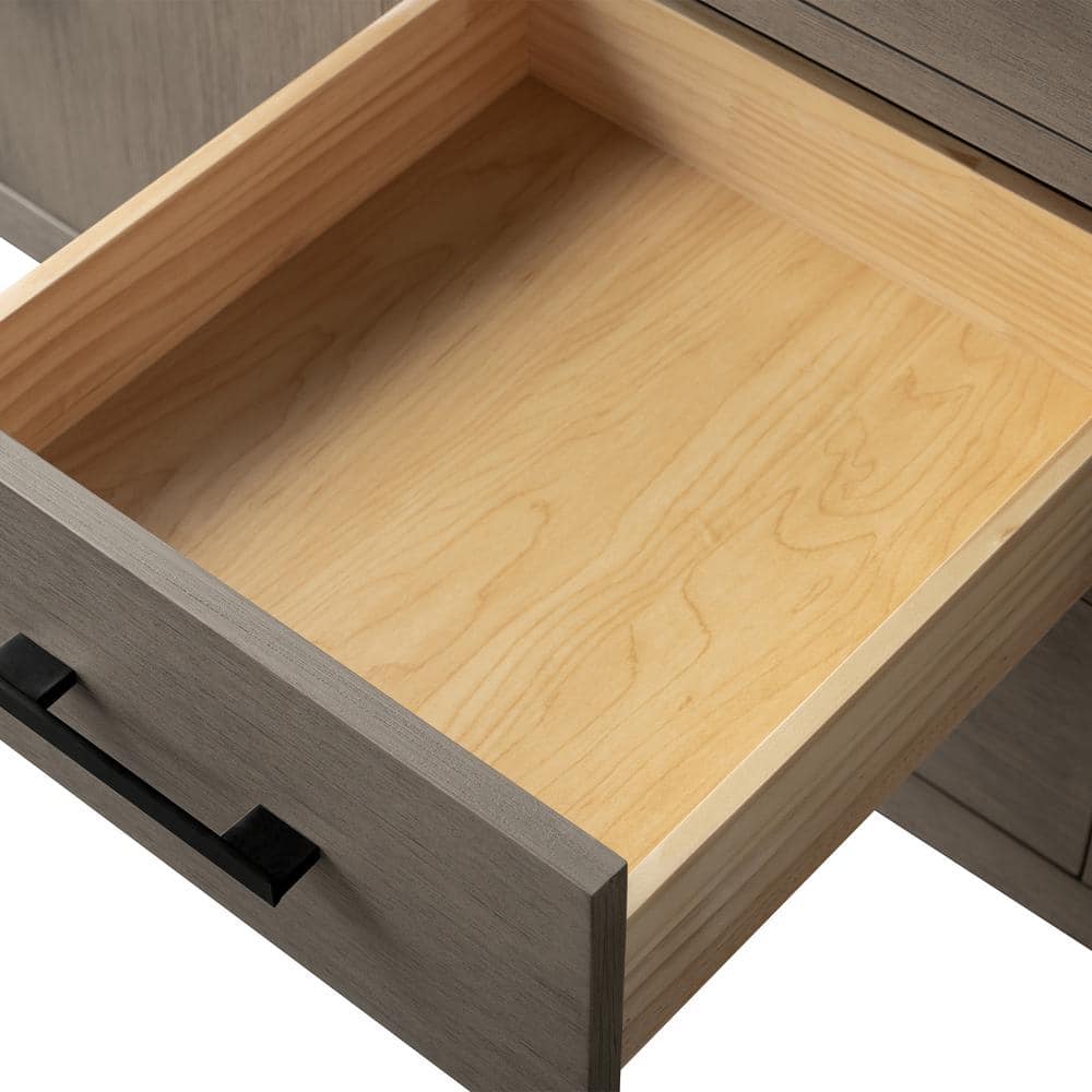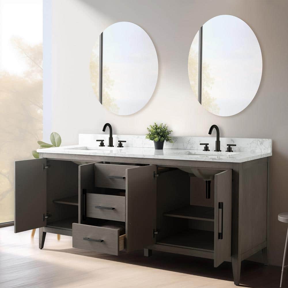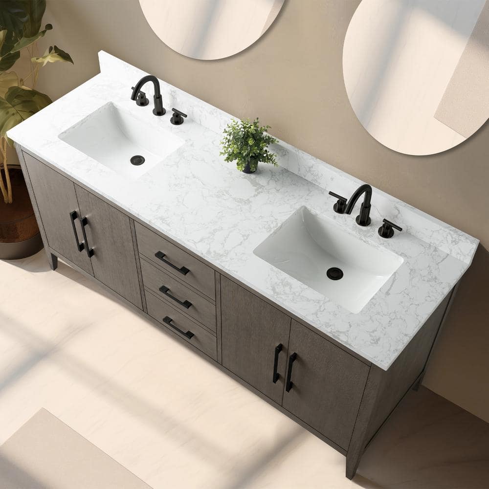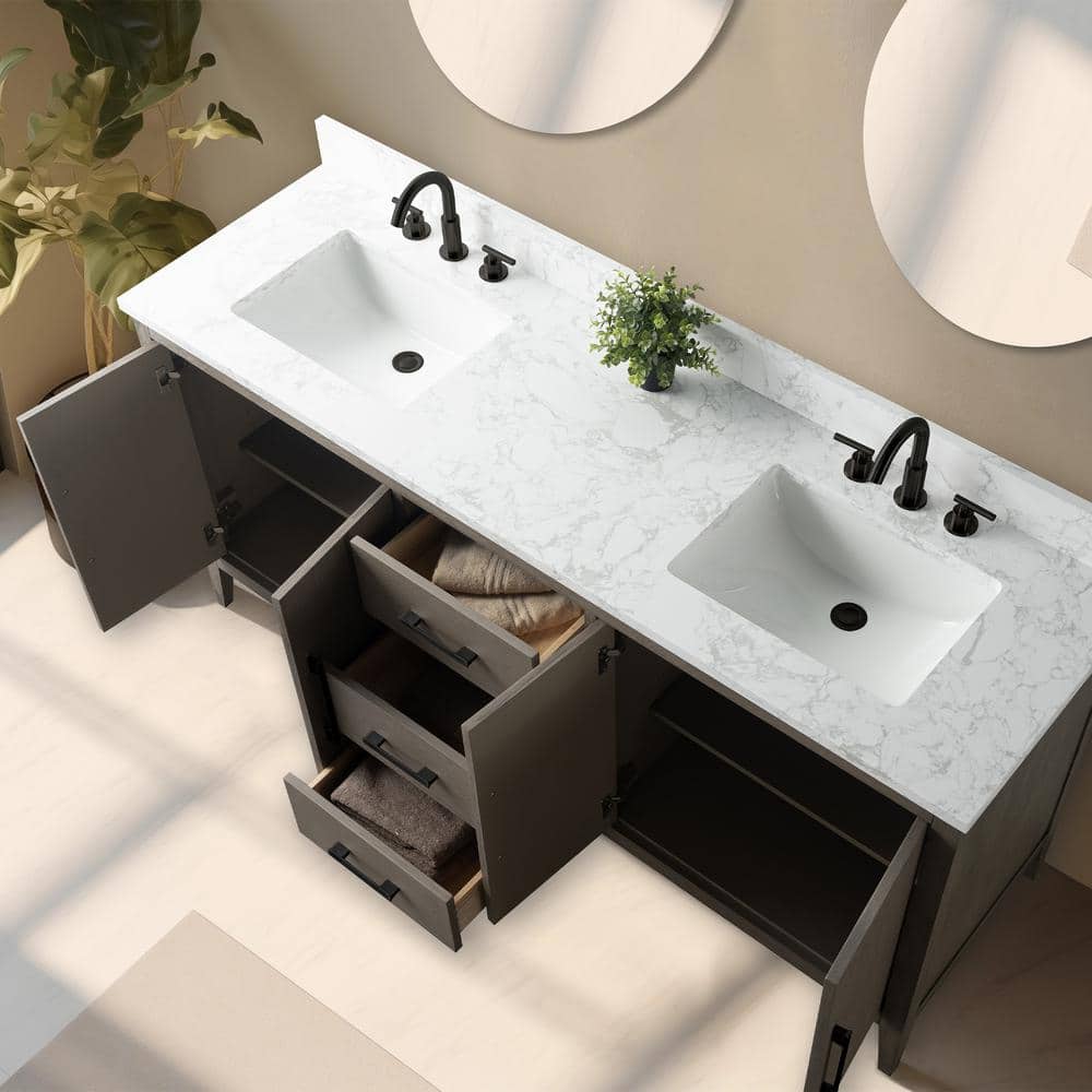 Picture this vanity as a centerpiece in your luxurious bathroom, its driftwood gray finish exuding a calm sophistication. The seamless contrast between the striking white engineered marble countertop and the deep ceramic sinks creates a visual harmony that captures modern elegance at its best. Imagine garnishing it with lush greenery or a line of sleek, matte black bathroom accessories for a chic, coordinated look. This vanity isn’t just a fixture; it’s a testament to refined taste and indulgent living, destined to transform simple routines into luxurious experiences.