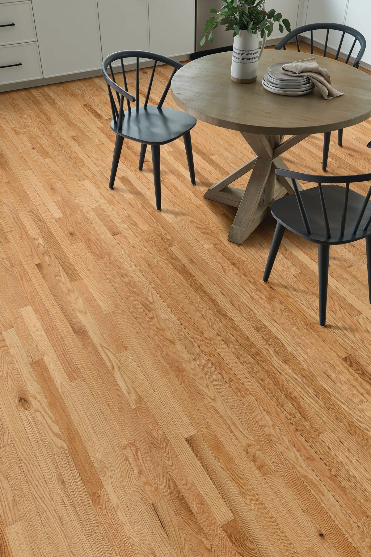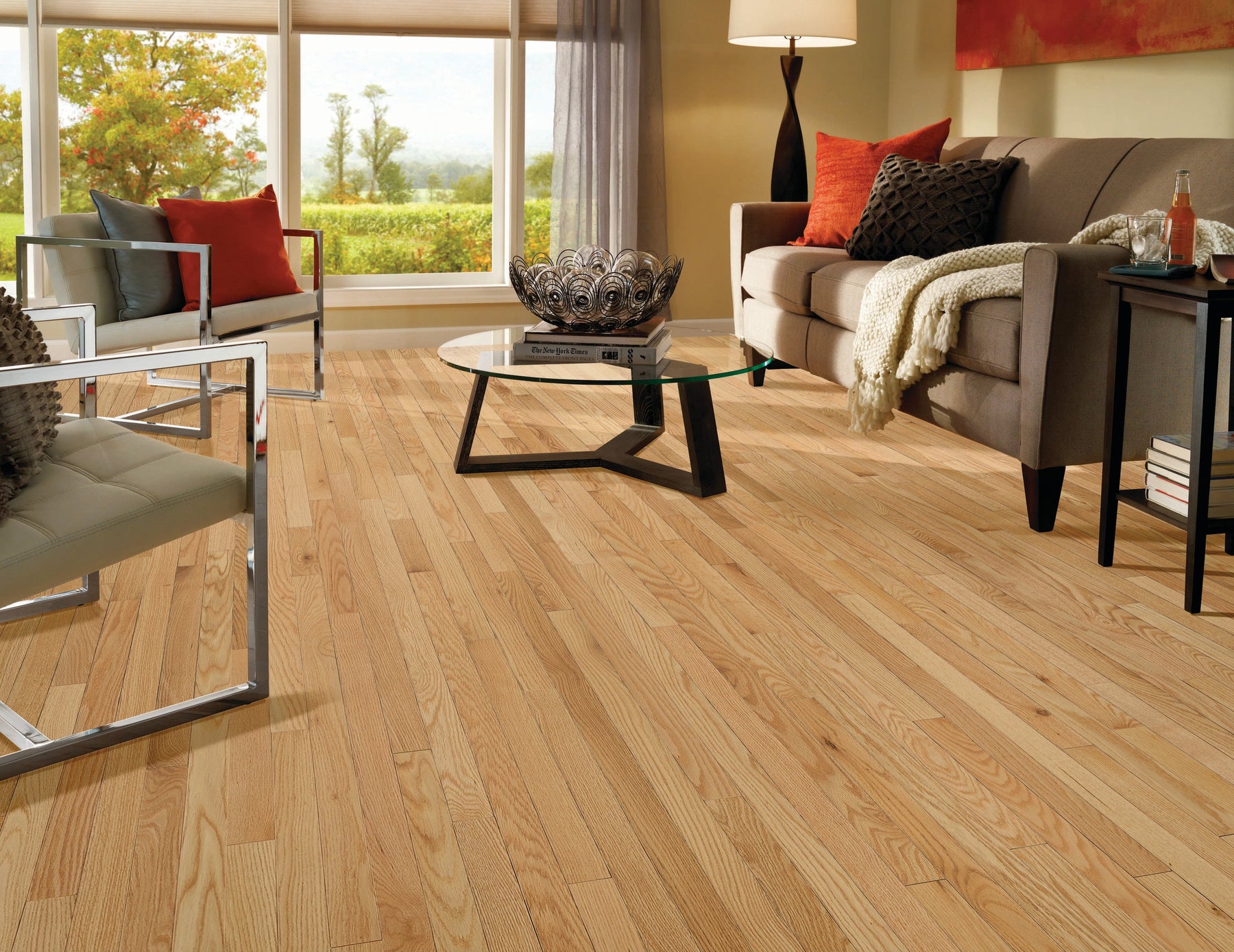 Transform any space into a haven of sophistication with Bruce Natural Red Oak Hardwood Flooring. This flooring's smooth, low-gloss finish captures the intrinsic charm and warmth of red oak, casting an inviting glow that complements both modern and traditional interiors. Pair with plush area rugs and contemporary furnishings for a layered look that exudes luxury. Elevate your design with flooring that not only enhances but defines a room's aesthetic.