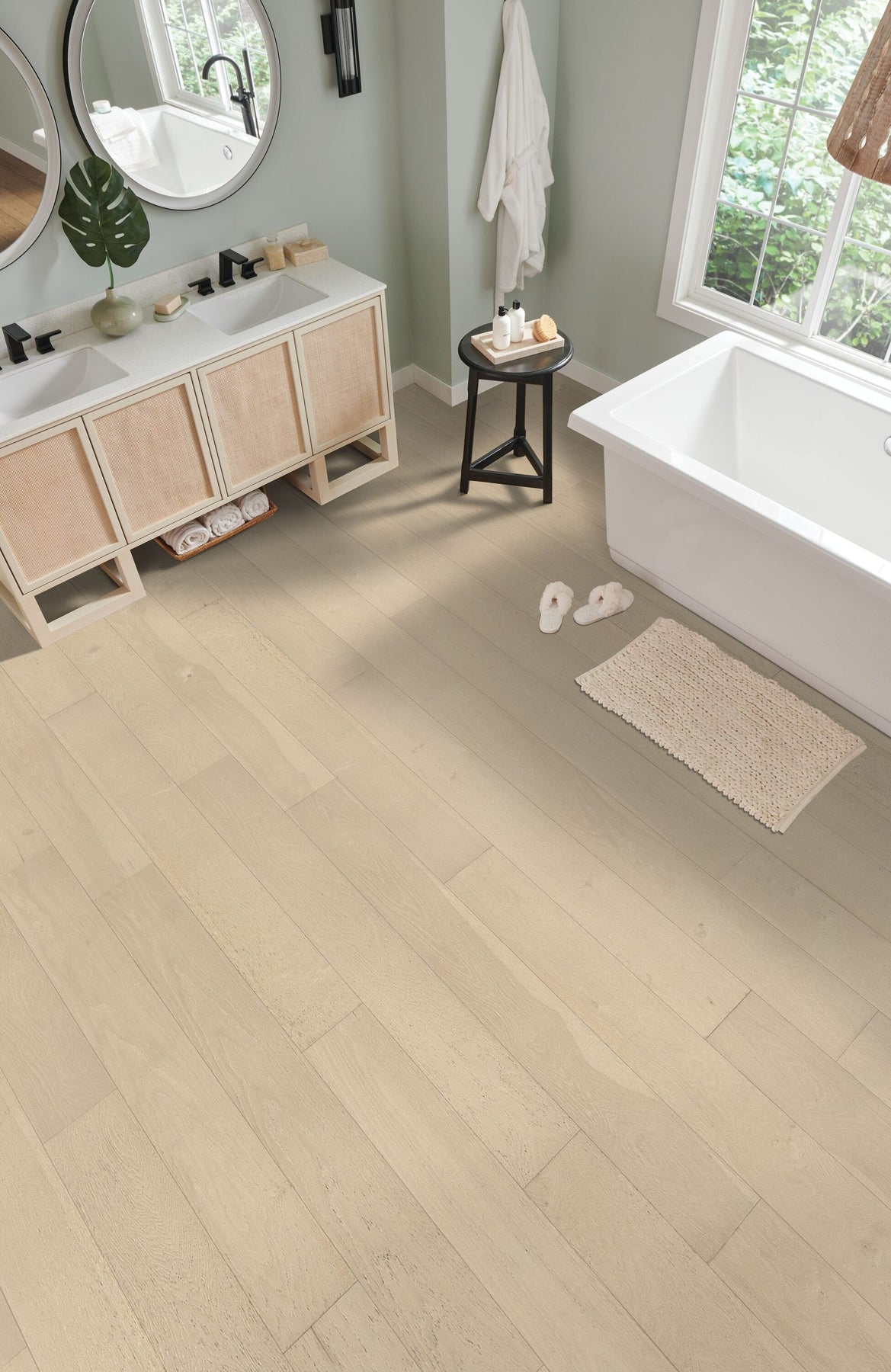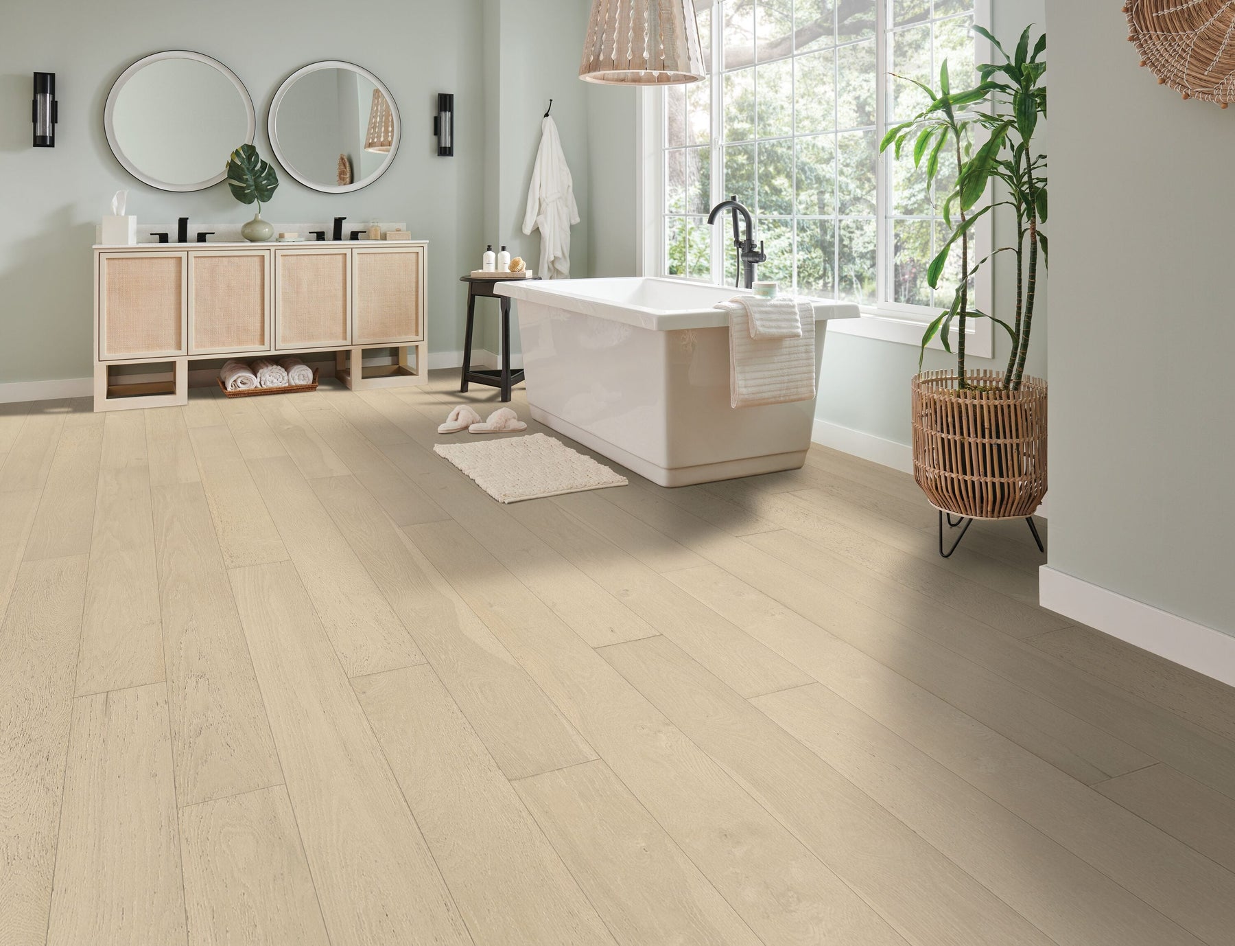 Transform your home into a haven of elegance with the Bruce Waterproof White Oak Engineered Hardwood Flooring. The subtly distressed, wirebrushed finish offers a delicate texture that enhances the serene beauty of a modern space. It's perfect for creating a Scandinavian-inspired oasis or a coastal retreat. Imagine this luxurious flooring as the canvas of your grand living room, paired with soft textiles and warm tones. It’s not just flooring; it's the foundation of your sophisticated home lifestyle.