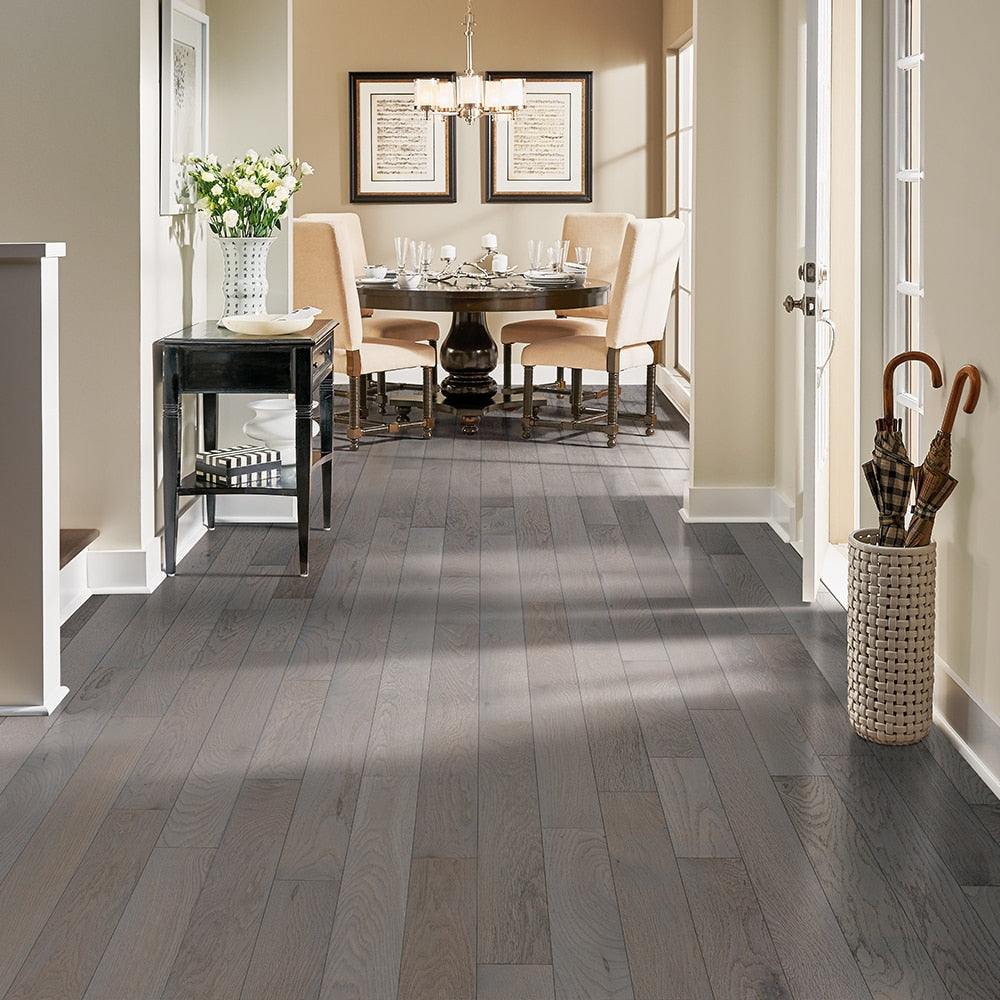 Bruce Nature of Wood White Oak flooring features a contemporary light gray finish that accentuates the beautiful grain of select Appalachian oak. Coated with Dura-luster® plus, it offers top-level protection against dirt and wear, ensuring long-lasting durability for residential spaces.