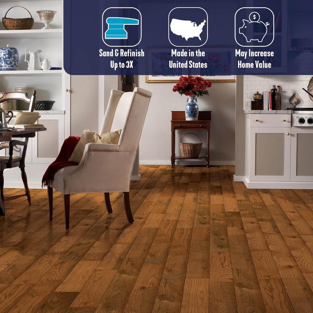 Introduce your home to the distinguished allure of gunstock oak, a testament to sophistication and durability. The high-gloss finish of this Bruce hardwood flooring catches light beautifully, transforming any space into a warm sanctuary. Pair it with leather furnishings or rustic metallic accents to create a bold yet inviting ambiance. This flooring is not just a surface—it's the foundation of a luxe lifestyle that celebrates enduring quality and style.