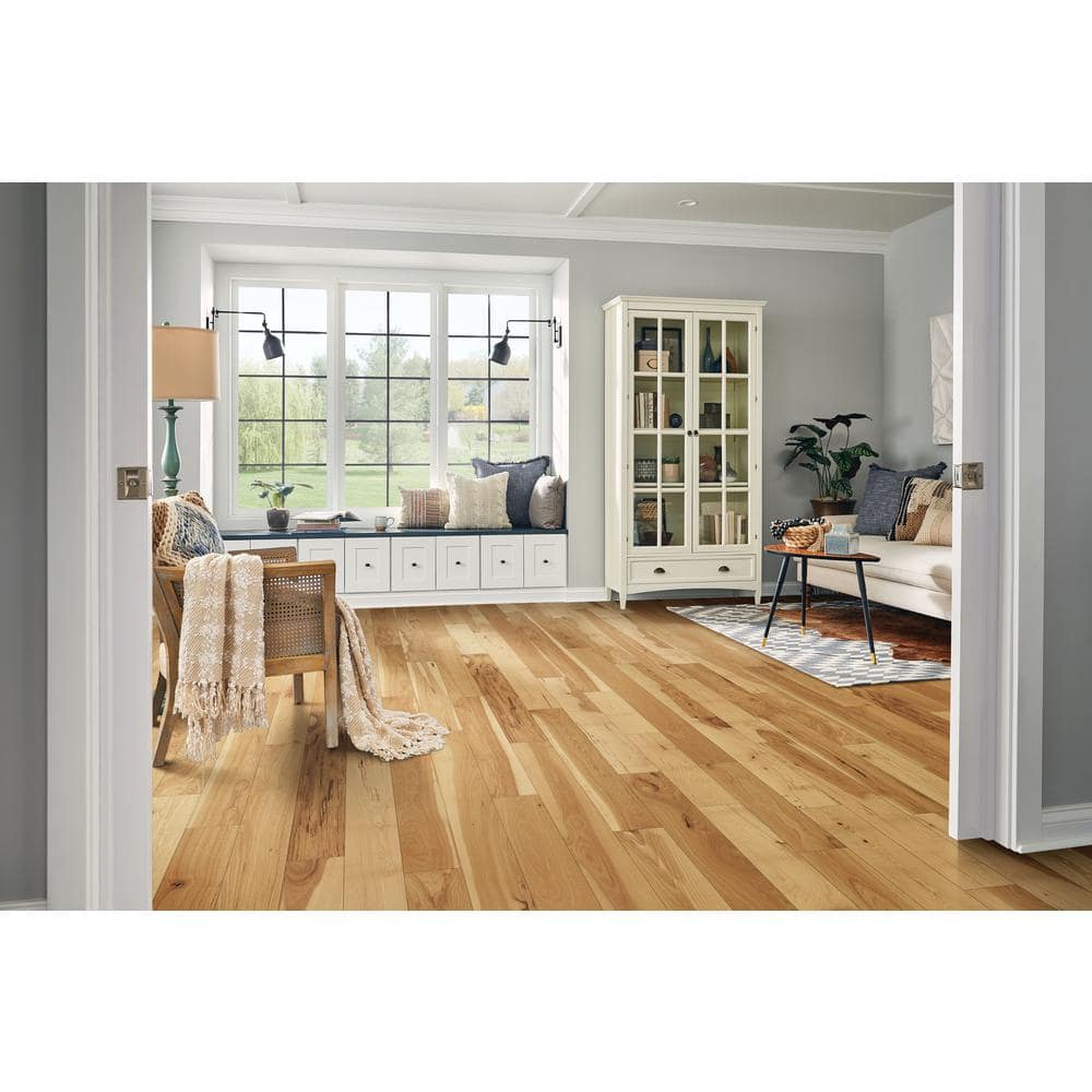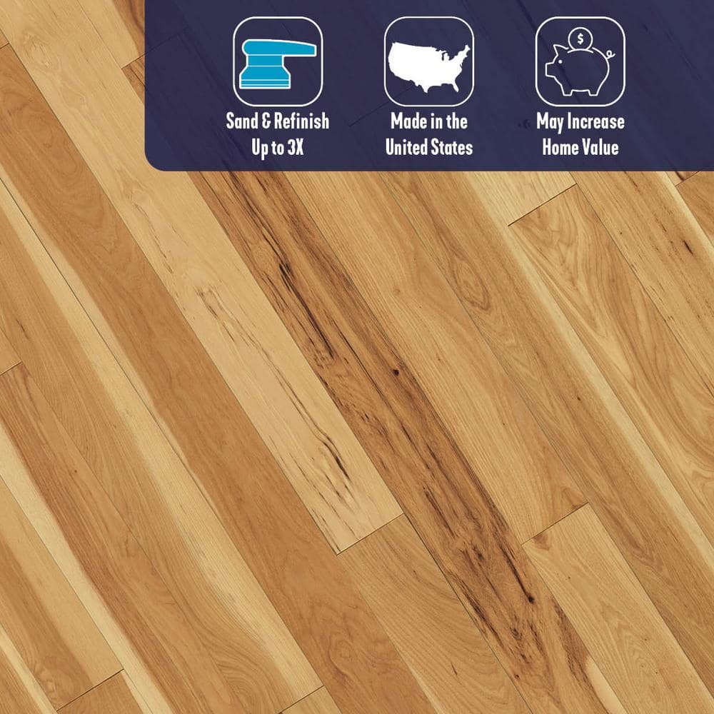 Elevate your home's interior with Bruce Natural Hickory Solid Hardwood Flooring. This premium flooring showcases the timeless beauty of hickory with its smooth finish and striking natural variations, including mineral streaks and knots. Engineered for durability and lasting beauty, it features a DuraLuster Finish and is made with over 90% domestic content.