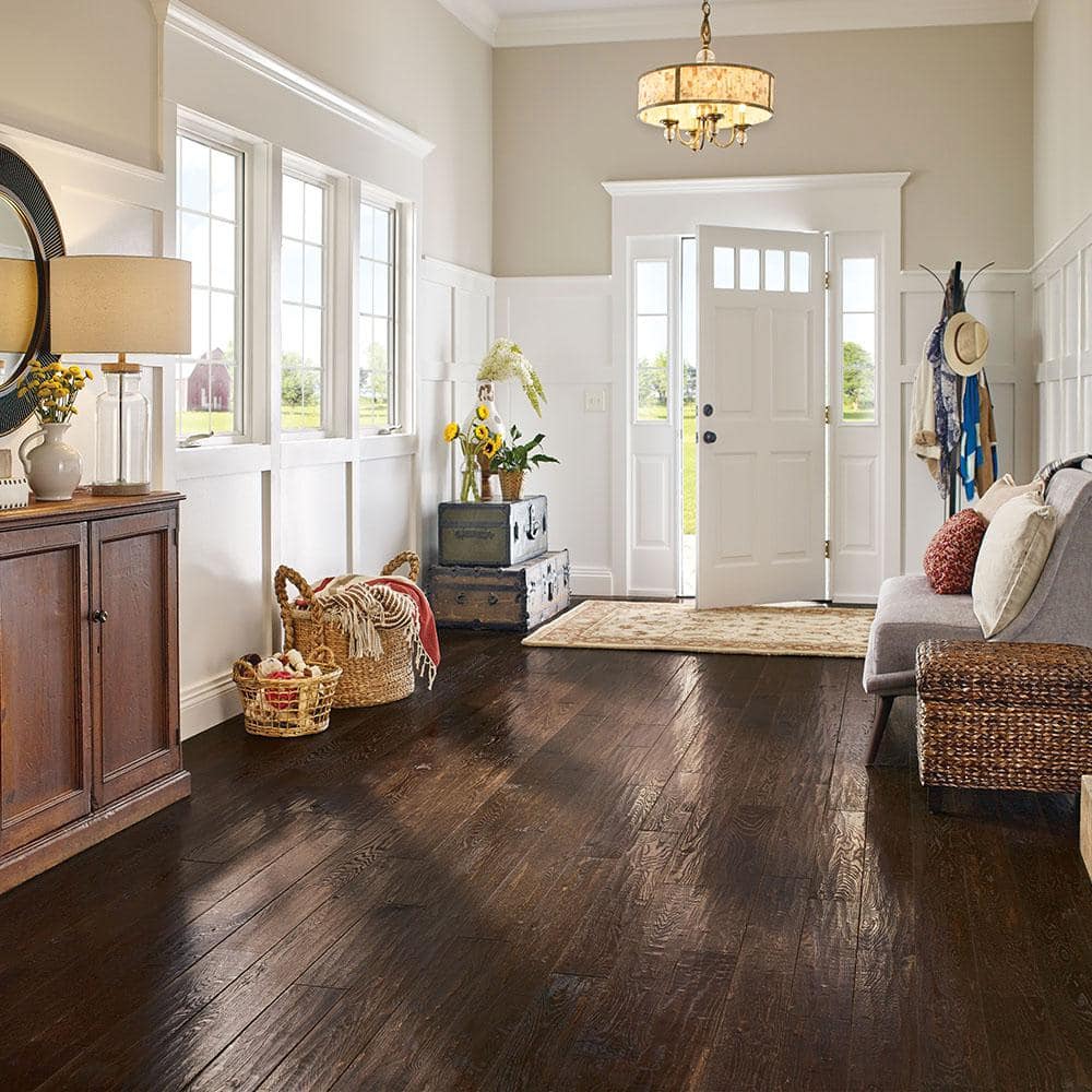 Bruce's Brown Harmony Oak flooring brings an artisanal charm that resonates with nature's grace. The hand-scraped finish reveals a tactile depth, reminiscent of timeworn artistry. Imagine this rich oak tapestry unfolding underfoot, adding a cornerstone of warmth and refinement to your interiors. As a versatile foundation for tranquil living or vivacious gatherings, this flooring embodies an essential indulgence in architectural allure.