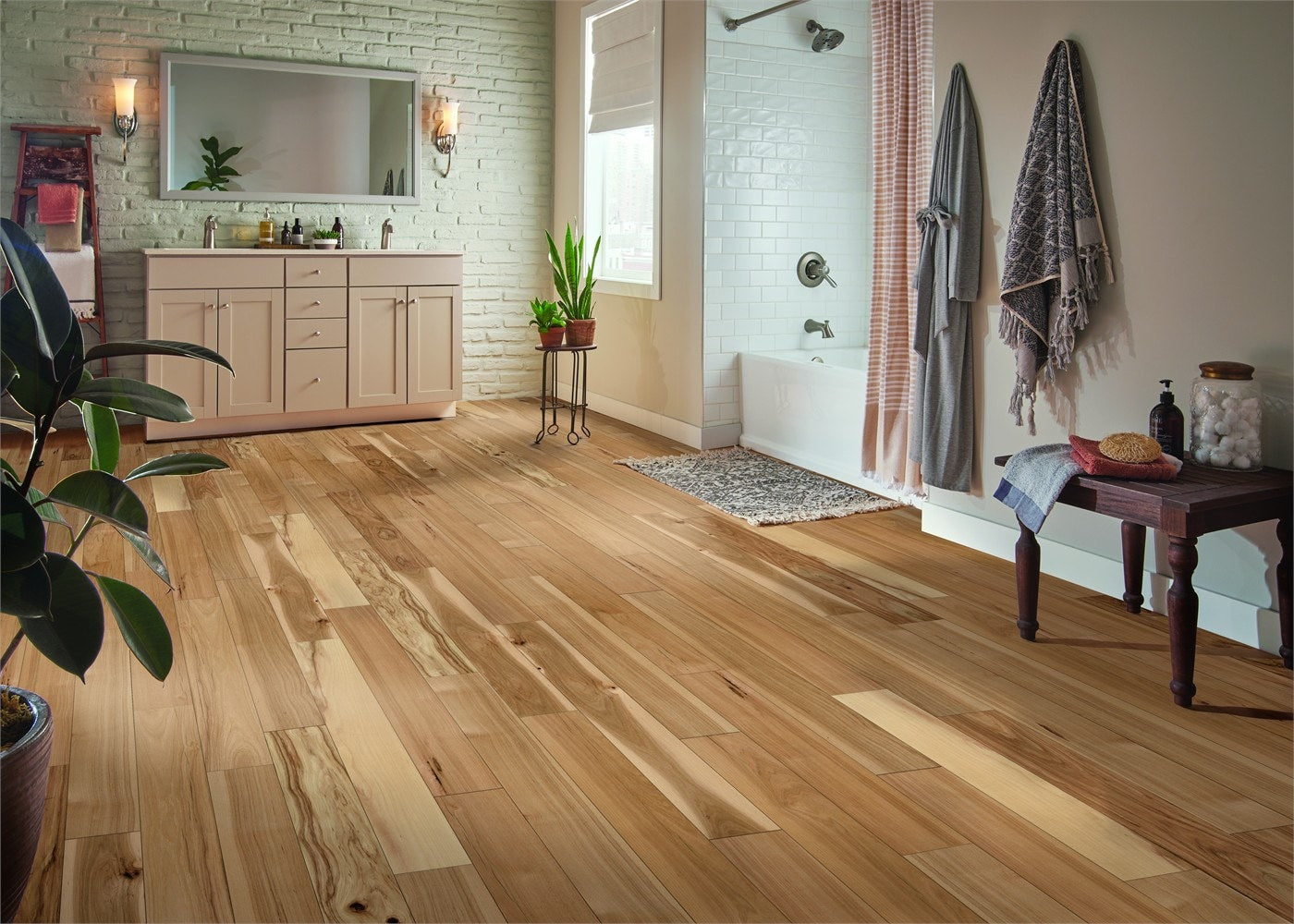 Transform your interiors with the sophisticated allure of Bruce’s Natural Hickory hardwood. This flooring captures the enchanting fusion of natural woodgrain and luminous hickory, creating an inviting ambience in any room. Its standout feature—a water-resistant finish—ensures practical elegance, allowing for placement in moisture-prone areas like kitchens and baths. Pair it with rustic decor for a cozy vibe or stark modern accents for a sleek contrast, making this flooring an essential canvas for chic, luxurious living.