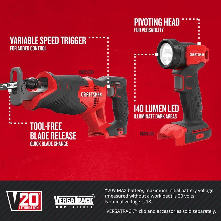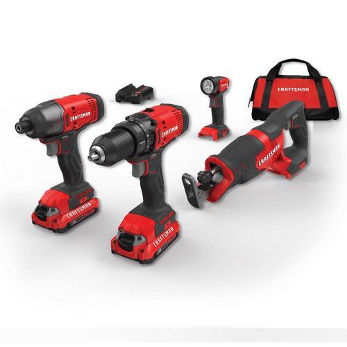 Includes (1) CMCD700 Drill/Driver; (1) CMCF800 Impact Driver; (1) CMCS300 Reciprocating Saw; (1) CMCL020 Task Light; (2) CMCB202 2.0Ah Li-Ion Battery; (1) 20V MAX Charger; (1) Storage Bag; (1) PH #2 Bit; (1) Double Sided Bit; (1) 6-in Recip Blade